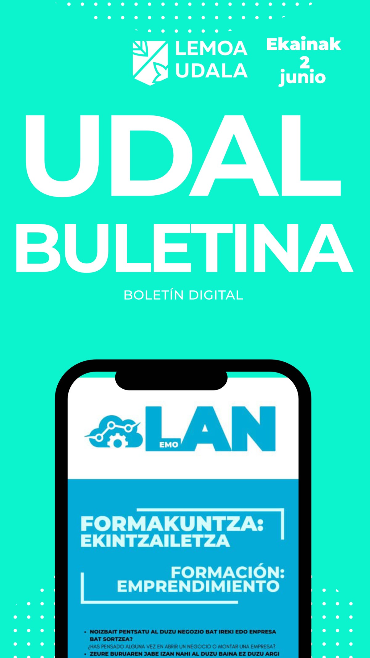 Atalak Udal buletina- Boletín digital Udal Buletina Ekainak 2 junio Gehiago irakurri titularraren gainean klikatuz Leer más haciendo click sobre el titular Post author Garatzailea: lemoatzen Post date 2023-06-01 Sticky post Boletín Municipal Nire erosketak Lemoan – Yo compro en Lemoa Ekintzailetza tailerra – Taller de emprendimiento Gazteen emantzipaziorako laguntzak eskatzeko epea ireki da– Se abre el plazo para solicitar las ayudas a la emancipación juvenil Jagon Lemoa 2023: Guraso eta seme-alaben arteko harreman emozionalak– Las relaciones emocionales entre padres/madre e hijos/hijas Umeen kontseilua:Teloi bat erdian – Consejo de la infancia:Un telón en medio Bete Lemoako kiroldegiari buruzko galdetegia: euskararen erabilera kiroldegian – Rellena el cuestionario sobre el Polideportivo de Lemoa: uso del euskara en el polideportivo Amaitu da liburutegiko kanpaina – Termina la campaña de la biblioteca Euskal Jaia aldaketekin! -¡Cambio en la Euskal Jaia ! NHIL Arraibiko ur jolasak, zabalik! – Abiertos los juegos acuáticos de Arraibi Kartel lehiaketara lanak aurkezteko epea gaur eguerdian bukatzen da– Hoy al mediodia finaliza el plazo para presentar trabajos al concurso de carteles Txutxin Txapelketa: finalerdiak – semifinales Lemoan Lan: asteroko lan postu eskaintzak – Ofertas semanales de empleo Comparte: Share on X (Opens in new window) X Share on Facebook (Opens in new window) Facebook Atsegin dut Kargatzen... Etiketak Ekainak 2 junio ← Lemoan Lan: asteroko lan postu eskaintzak – Ofertas semanales de empleo → Lemoan Lan: asteroko lan postu eskaintzak – Ofertas semanales de empleo