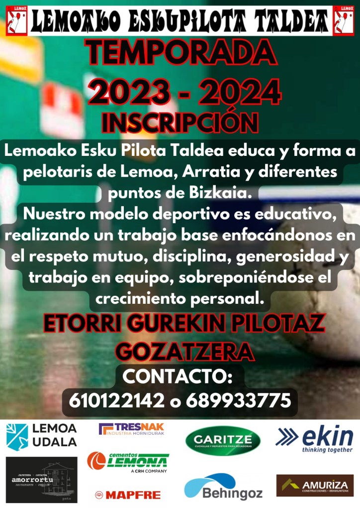 [cas] Lemoako Eskupilota Taldea abre su periodo de inscripciones, y promete una experiencia enriquecedora a los y las deportistas del municipio. Reconocida por su arduo trabajo y dedicación, esta escuela destaca por inculcar valores sólidos y ofrecer una formación integral a sus deportistas.