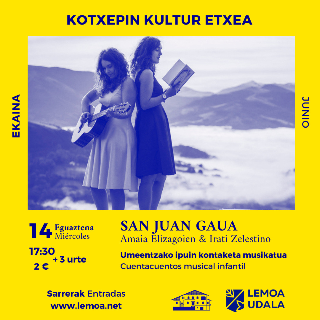 Sarrerak / Entradas: https://kultura.lemoa.net/sarrerak [eus] Amaia Elizagoien eta Irati Zelestinok Kulturklik-en; “Gau ederra dugu San Juan gaua, espiritu txarrak, beldurrak eta kezkak gainetik kentzeko ederra baita. Guk baditugu egun honen baitan gertatu ziren zenbait istorio eder. Baina hauek ez ditugu erreko. Hauek entzunez suaren bueltan sortzen den goxotasuna eta berotasuna elkarbanatzen saiatuko gara”. [cas] Amaia Elizagoien … Irakurtzen jarraitu San Juan Gaua