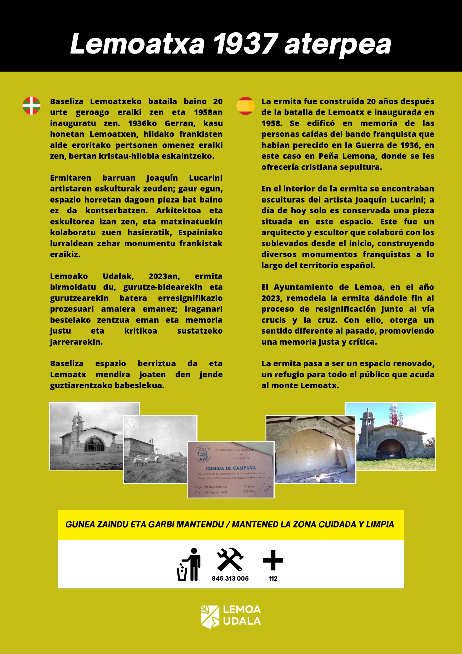 [eus] Lemoako Udalak goiko ermita aterpe bihurtzeko lanak bukatu ditu eta bihar zabalduko da. Asmoa da mendira edo paseatzera joaten diren pertsonek aterpe bat izatea mokadutxoa egiteko, atseden hartzeko edo eguraldi txarretik babesteko, eta bertara irteera edo txangoak antolatu ahal izatea. [esp] El Ayuntamiento de Lemoa ha finalizado las obras para convertir la ermita de … Irakurtzen jarraitu San Antolineko ermita zabalik bihartik aurrera – A partir de mañana se abre la ermita de San Antolin