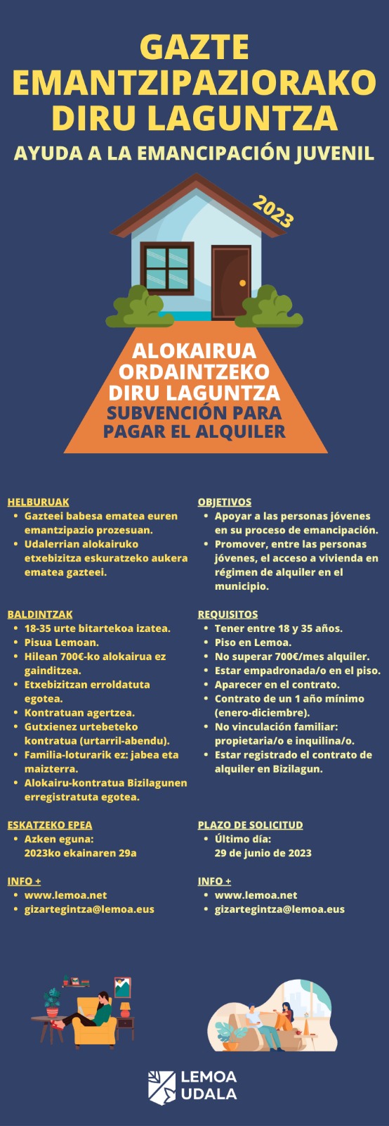 [eus] Bi dira deialdi honen helburuak: gazteei emantzipazio-prozesuan zein helduen mundura sartzeko unean laguntzea, eta gazteei alokairuko etxebizitza eskuratzeko aukera ematea Lemoako udalerrian. Diru-laguntzak 8.ooo euroko aurrekontua du, eta laguntzak eskatzeko epea ekainaren 29an amaituko da. Diru-laguntzaren helburua Lemoan ohiko alokairuko etxebizitza bat duten 18 eta 35 urte bitarteko gazteei alokairua partzialki ordaintzea da. Oinarrietan … Irakurtzen jarraitu Gazteen emantzipaziorako laguntzak eskatzeko epea ekainaren 29an bukatzen da– El 29 de junio finaliza el plazo para solicitar las ayudas a la emancipación juvenil