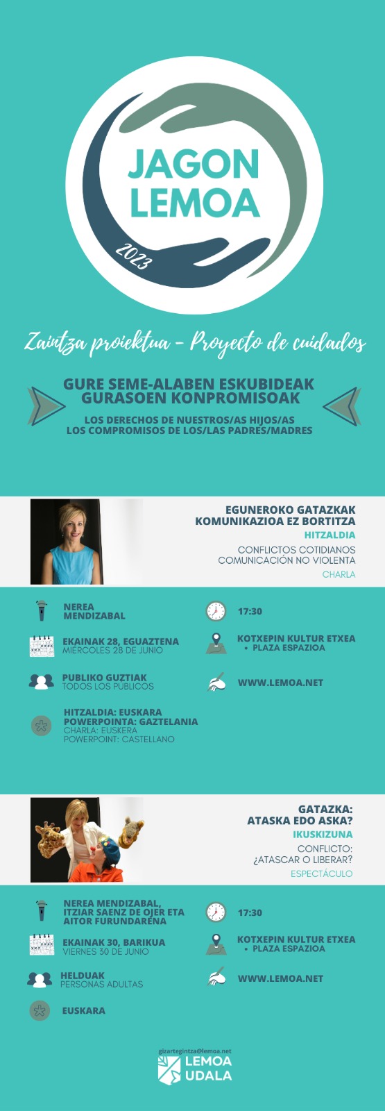 [eus] Jagon Lemoa proiektuaren 2023ko edizioaren gaia honakoa da: “Gure seme-alaben eskubideak, gurasoen konpromisoak”. Lanketa honetarako familion inplikazioa ezinbestekoa izango da. Proiektuaren lehen bi faseetan familien inkesta eta horren inguruko lanketa egin da, eta orain hirugarrena jarri da martxan. Ekainean zehar familiekin landuko den programazioa prestatu da. Lehen saioa ekainaren hasieran egin zen, eta orain … Irakurtzen jarraitu Jagon Lemoa 2023: eguneroko gatazkak, komunikazio ez bortitza – conflictos cotidianos, comunicación no violenta