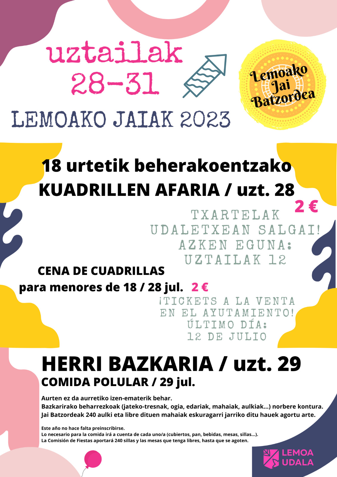 [eus] Aurreko urteetan ez bezala, aurten ez da aurretiko izen-ematerik behar herri bazkarira joateko. Bestetik, beharrezkoak diren jateko tresnak, ogia, edariak, mahaiak eta aulkiak norbere kontura izango dira. Jai batzordeak 240 aulki eta libre dituen mahaiak eskuragarri jarriko ditu hauek agortu arte. [cas] A diferencia de años anteriores, este año no es necesaria la inscripción … Irakurtzen jarraitu Aldaketak herri bazkariari begira – Modificaciones de cara a la comida popular