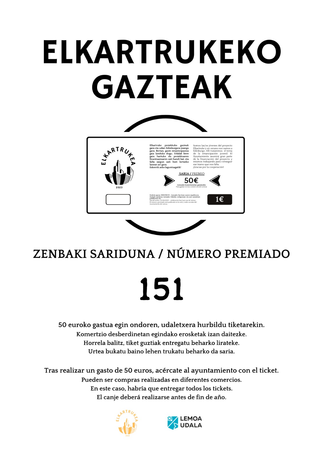 [eus] Los y las jóvenes del proyecto Elkartrukea organizan un sorteo para sufragar una parte del viaje que realizan cada año, y el número premiado de este año ha sido el 151. El o la ganadora deberá realizar un gasto de 50 euros en los comercios de la localidad, antes de que finalice el año, entregar los tickets en el Ayuntamiento y recibirá ese importe a cambio.