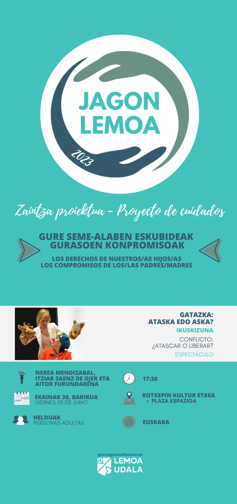 [eus] Nerea Mendizabal Psikopedagogoak eta Itziar Saenz De Ojer “Pituxa” Pedagogoak harremanen inguruan hausnartzeko begirada umoretsua duen kantu eta elkarrizketa saioa eskainiko digute gaur. Komunikazio ez bortitzaren ikuspegia antzerki, umore, musika eta edukiekin nahastutako ikuskizun dibertigarri honek edonorentzat esanguratsuak zaizkigun egoeretatik askatzeko arintasuna eskaini nahi digu. Ekimen honekin Jagon Lemoa 2023 zaintza programa bukatuko da. … Irakurtzen jarraitu Jagon Lemoa 2023: azken ekimena – ultima actividad