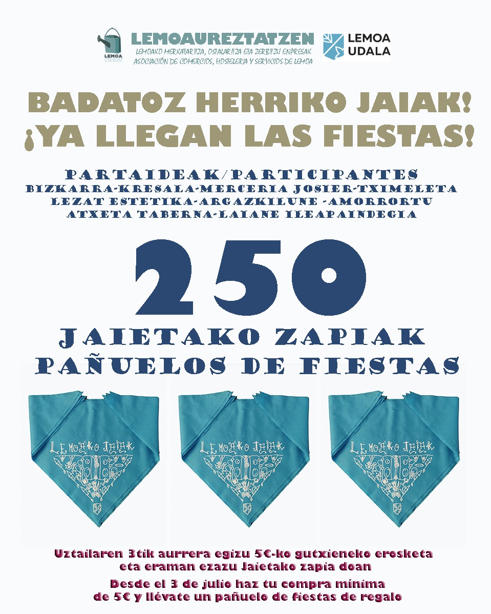 [eus] Uztailaren 3tik aurrera egizu 5 €-ko gutxieneko erosketa eta eraman ezazu jaietako zapia doan. [cas] A partir del 3 julio y por una compra mínima de 5 euros te llevarás el pañuelo de fiestas de regalo.