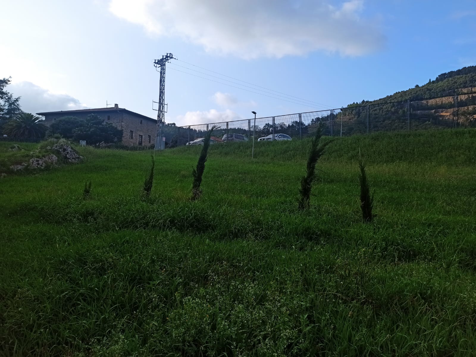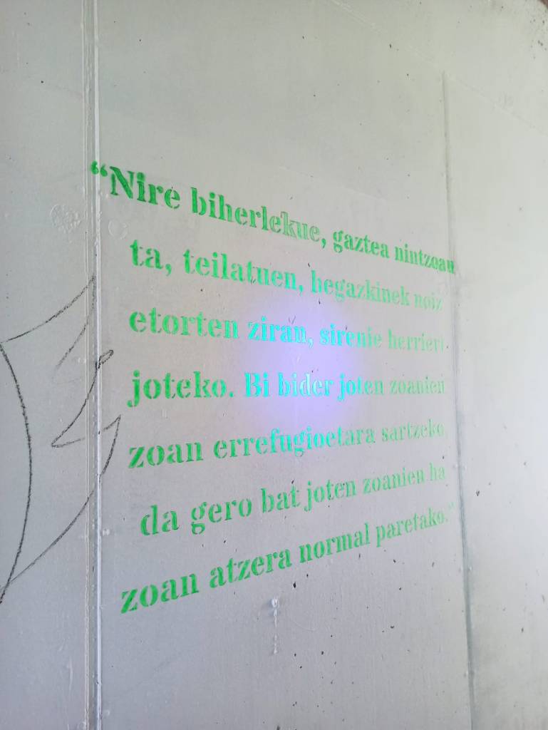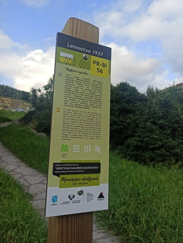 [eus] Memoria eta Kultur astean eguraldi kaskarra dela eta atzeratu zen ekintza egin zen pasa den astean. Iker Vazquezek gerra garaia gaitzat hartuta lau interbentzio egin ditu: lurrean idatzitako esaldiak, pasabideko irudia, harrizko jesarlekua eta zuhaitzak.