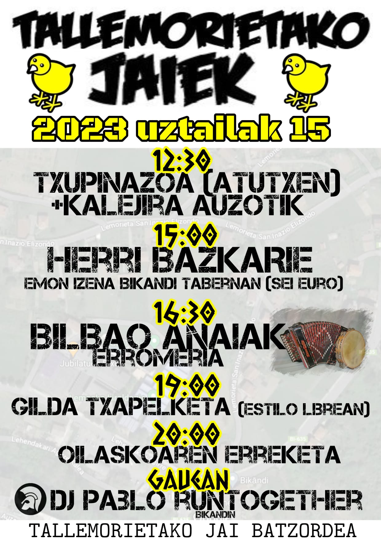 [Eus] Tallerreta eta Lemorrietako auzoek uztailaren 15ean ospatuko dituzte jaiak. Tallemorietako Jai Batzordeak egun osoko egitaraua antolatu du auzoetako kaleak jai giroan murgiltzeko asmoarekin. Egitaraua honakoa da: [Esp] Los barrios de Tallerreta y Lemorrieta celebrarán sus fiestas el 15 de julio. La Comisión de Fiestas Tallemorieta ha organizado un programa completo con el objetivo de … Irakurtzen jarraitu Badatoz Tallerreta eta Lemorrietako jaiak!-¡Ya llegan las fiestas de Tallerreta y Lemorrieta!