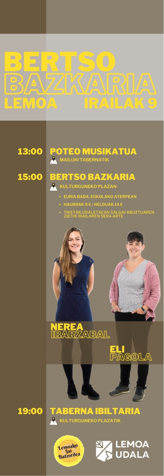 [Eus] Aurten ere, Andramariko jaietan, urteroko bertso bazkaria egingo da irailaren 9an. Nerea Ibarzabal eta Eli Pagola bertsolariak izango dira bertan. Bazkaria 15:00etan izango da Kulturguneko plazan. Bertso bazkariaren aurretik poteo musikatua egingo da herrian zehar, Mailuki tabernatik abiatuta, eta bazkalosteko bertso saioaren ondoren, 19:00etan, Taberna Ibiltaria izango da Kulturguneko plazatik hasita. [Esp] Un año … Irakurtzen jarraitu Bertso bazkaria Andra Mari jaietan – Bertso bazkaria en fiestas de Andra Mari