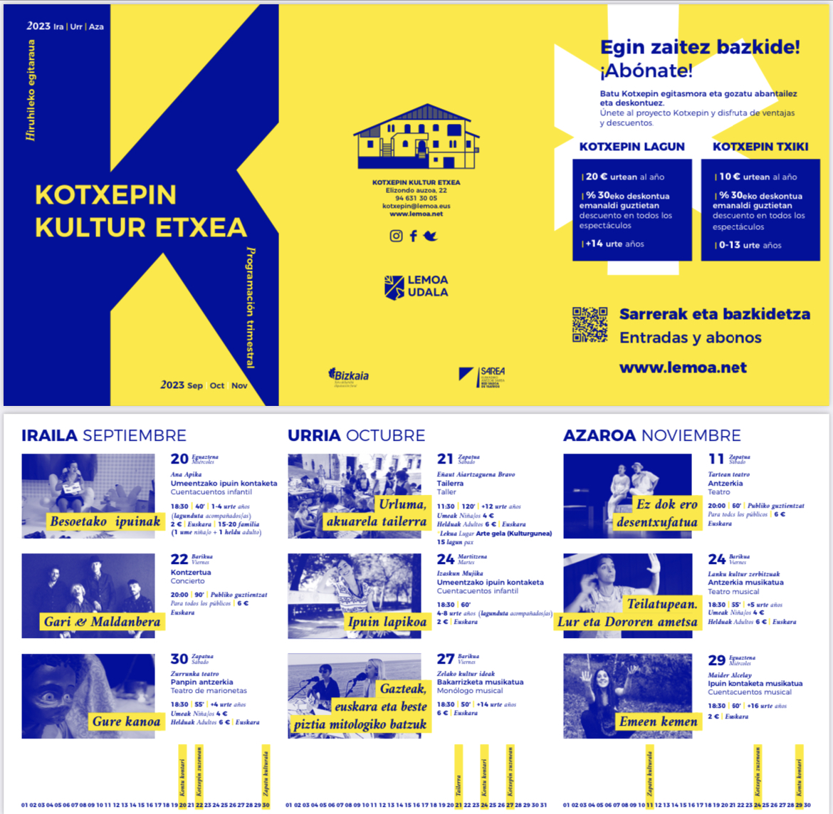 [Esp] Kotxepin Kultur Etxea ha anunciado su programación trimestral, con funciones y actividades para todos los públicos. Septiembre se estrena con Ana Apika y su “Besoetako ipuinak”, una sesión de cuentos pensada para los más pequeños de la casa. Tampoco faltará la música en septiembre con el concierto de Gari & Maldanbera, donde podremos disfrutar, cantar y bailar al son de sus canciones. Además, en octubre podremos asistir a un taller de acuarela que se realizará en el Kulturgune, y a un monólogo musical, entre otros. Por último, el teatro será el protagonista en noviembre, pues contaremos con dos funciones teatrales, una de ellas musical (“Teilatupean. Lur eta Dororen ametsa”), y un cuentacuentos musical (“Emeen kemen”), por lo que tampoco nos faltará la música en noviembre.
