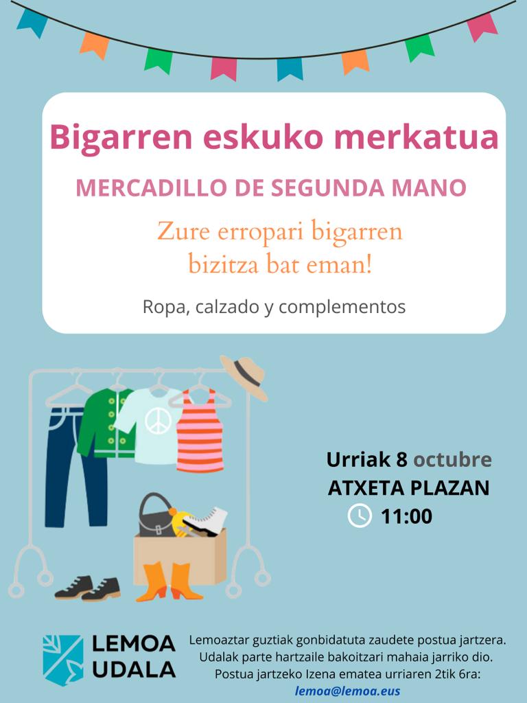 [Eus] Domeka honetan, urriak 8, bigarren eskuko merkatua izango dugu Lemoan. Lemoaztar guztiak gonbidatuta zaudete postua jartzera. Udalak parte hartzaile bakoitzari mahaia jarriko dio. Merkatua Atxeta plazan izango da 11:00etan. Eman zure arropari bizitza berri bat! Postua jartzeko izen-emate epea gaur, urriak 6, amaitzen da. Postua jarri gura baduzu, idatzi hurrengo helbidera: lemoa@lemoa.eus [Esp] Este … Irakurtzen jarraitu Bigarren eskuko merkatua – Mercadillo de segunda mano