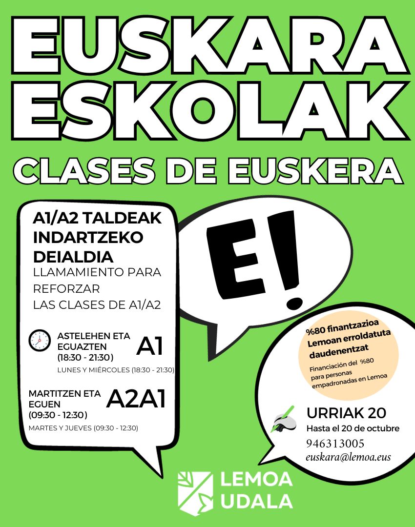 [Eus] Irailean egin da Lemoako euskara eskoletako matrikulazio kanpaina, eta denetara bost talde sortu dira. Horietatik bi indartu gura dira, eta horregatik, deialdi berezia zabaldu du udalak urriaren 20ra arte. Bi talde hauek indartu gura dira: