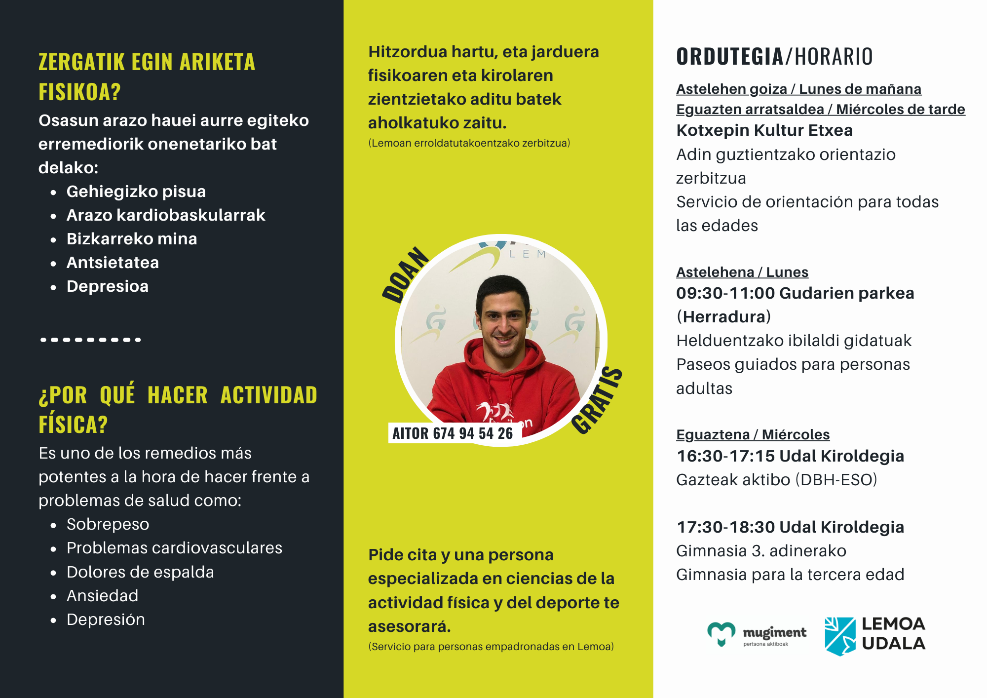 [Eus] Aurten ere Oingabiz zerbitzua jarri dugu martxan Lemoan, jarduera fisikoko orientazio zerbitzua. Doakoa da, eta hauek dira eskaintzen dituen aukerak: