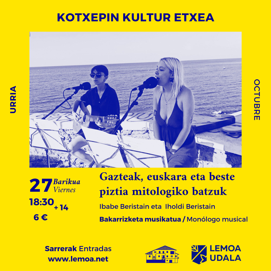 [Eus] Bakarrizketa musikatu honetan Iholdi eta Ibabe Beristain ahizpa gazteen ahotsa izango da nagusi, eta egungo gazte euskaldunen larruan jartzen lagunduko digute hitzen eta musikaren bidez. Animatu eta etorri Kotxepinera urriaren 27an. Ez zarete damutuko!