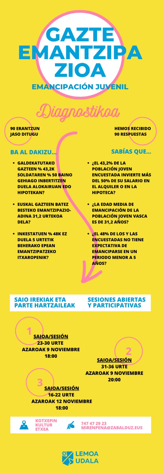 [Eus] Duela hilabete batzuk, Lemoako Udalak herriko gazteen emantzipazioari buruzko azterketa eta diagnostikoa jarri zuen abian. Lehen pauso moduan, inkesta bat egin zitzaien herriko gazteei, haien kezkak, beharrak eta nahiak identifikatzeko. Guztira, 90 erantzun jaso ziren, eta hauek dira datu aipagarrienetako batzuk: Orain, inkestan lortutako emaitzekin, 3 saio partehartzaile egingo dira adin-tarte eta talde ezberdinekin. … Irakurtzen jarraitu Gazte emantzipazioa Lemoan: bizi-proiektuak garatzeko aukeren bila –Emancipación juvenil en Lemoa: en búsqueda de oportunidades para desarrollar proyectos de vida