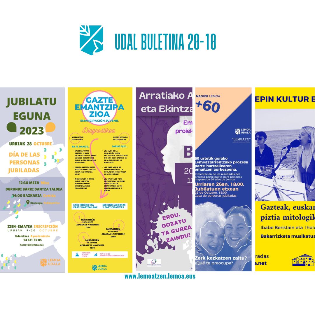 Atalak Udal buletina- Boletín digital Udal Buletina Urriak 20 octubre Gehiago irakurri titularraren gainean klikatuz Leer más haciendo clic sobre el titular Post author Garatzailea: lemoatzen Post date 2023-10-20 Sticky post Boletín Municipal Lehen 100 egunen balantzea – Balance de los 100 primeros días Aurrekontuak: herritarren partaidetza – Presupuestos: participación ciudadana Proiektu batean sartu da Lemoa, eskariaren araberako garraio-zerbitzuaren ingurukoan – Lemoa entra en un proyecto de servicio de transporte a demanda Udal-lokala Lemoa Txirrindulari Elkartearentzat – Local municipal para Lemoa Txirrindulari Elkartea Lemoako memoria historikoaren proiektuak hildakoen baseliza babesleku bihurtu du – El proyecto de memoria histórica de Lemoa convierte la ermita de los caídos en refugio Gazte emantzipazioa Lemoan: bizi-proiektuak garatzeko aukeren bila –Emancipación juvenil en Lemoa: en búsqueda de oportunidades para desarrollar proyectos de vida Nagusi Lemoa: 60 urtetik gorako lemoaztarrentzako prozesu parte-hartzailearen emaitzen aurkezpena – Presentación de los resultados del proceso participativo para personas mayores de 60 años de Lemoa Jubilatuen Eguna 2023 – Día de las Personas Jubiladas 2023 Arratiako Andra Sortzaile eta Ekintzaileen III. Azoka Arratiako maratoi txikia 2023 Urluma akuarela tailerra – Taller de acuarelas Ipuinen Lapikoa – Izaskun Mujika Gazteak, euskara eta beste piztia mitologiko batzuk: Ibabe eta Iholdiri elkarrizketa – Entrevista a Ibabe e Iholdi Lemoan Lan: asteroko lanpostu eskaintzak – Ofertas semanales de empleo Comparte: Share on X (Opens in new window) X Share on Facebook (Opens in new window) Facebook Atsegin dut Kargatzen... ← Gazteak, euskara eta beste piztia mitologiko batzuk: Ibabe eta Iholdiri elkarrizketa – Entrevista a Ibabe e Iholdi → Lemoan Lan: asteroko lanpostu eskaintzak – Ofertas semanales de empleo