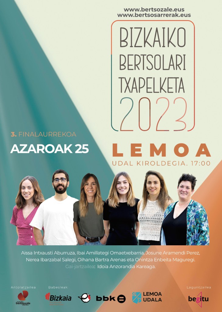 [Eus] Bizkaiko Bertsolari Txapelketak aurrera jarraitzen du. Sei kanporaketak jokatu ostean, erabakita geratu dira finalaurrekoak. Azaroaren 11n izango da lehenengoa, Berrizen; bigarrena, Santurtzin azaroaren 18an eta, azkenengoa, Lemoan, azaroaren 25ean.