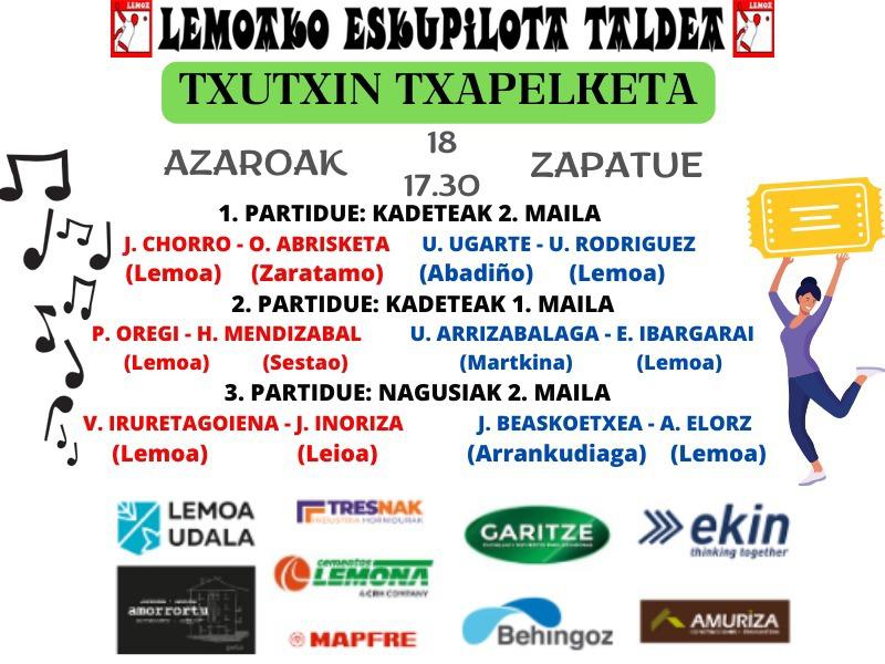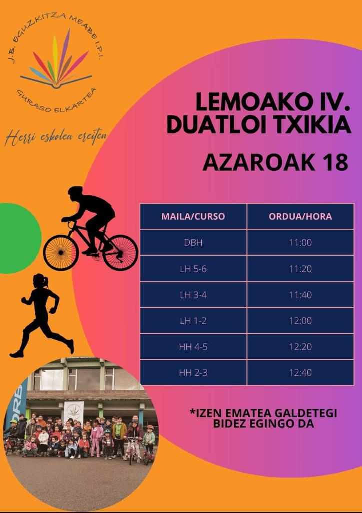 [Esp] La Semana de Actividad Física y Deporte trae un fin de semana repleto de actividades. Hoy por la tarde, a las 18:30, tendrá lugar “Dantzan Plazaz Plaza” de la mano de Durundibarri Dantza Taldea. El sábado, por su parte, será protagonista el público infantil, ya que la mañana estará llena de actividades dirigidas a las y los más pequeños: pádel y frontenis, IV. Duatloi Txikia y Bizikleta Ginkana, entre otros. Además, por la tarde, tendrá lugar la Txutxin Txapelketa de Lemoako Eskupilota Taldea, donde además de disfrutar del juego de los pilotaris, también habrá ocasión de disfrutar de música, pincho pote y premios. Por último, el domingo, la competición Lemoatx Trail pondrá fin a la semana.