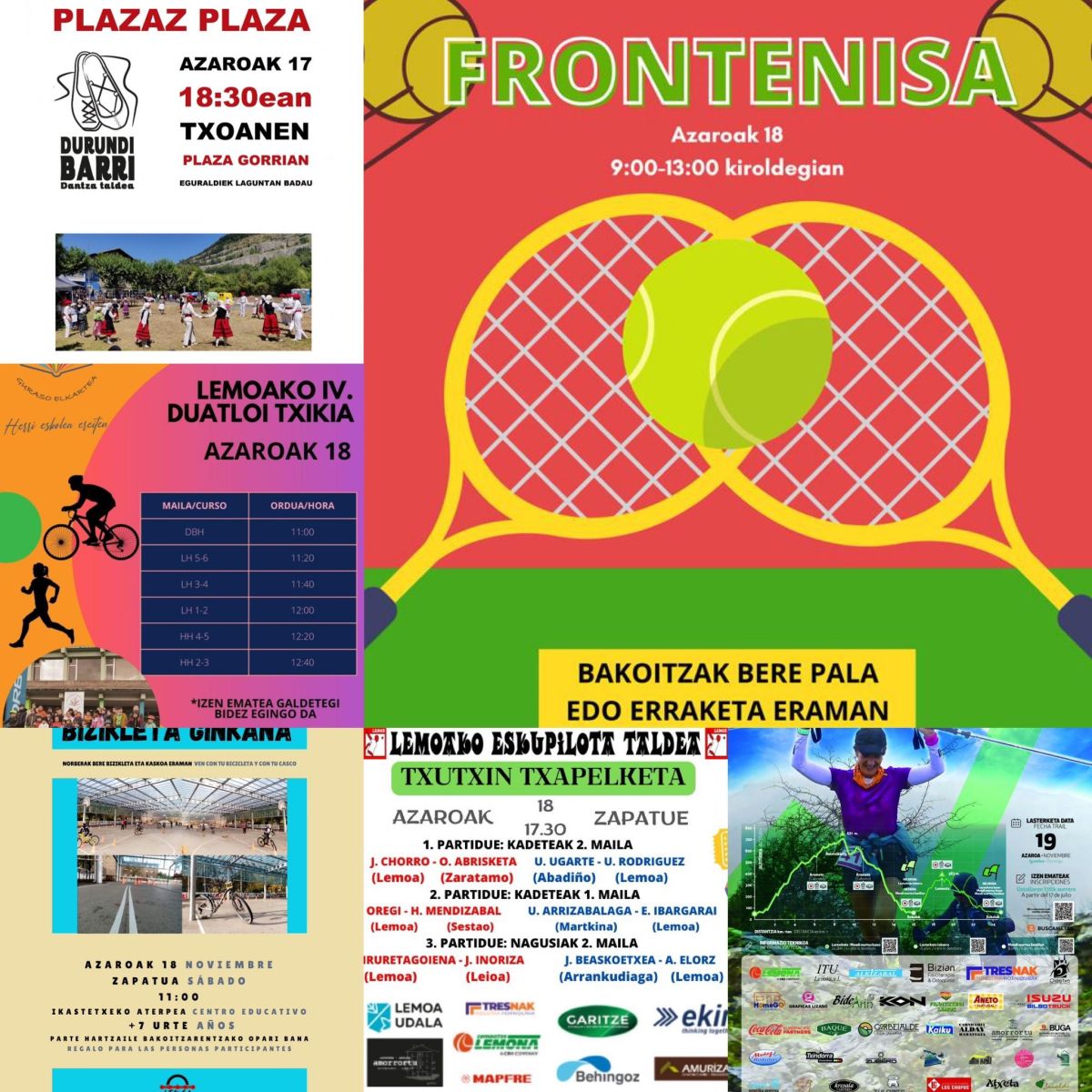 [Eus] Kirol eta Ariketa Fisikoaren Asteak jardueraz beteta dakar asteburua. Gaur arrastian, 18:30ean, Dantzan plazaz plaza jarduera izango da, Durundibarri Dantza Taldearen eskutik. Zapatuan, berriz, haurrak izango dira protagonista; izan ere, haiei zuzendutako jardueraz beteta izango da goiza: padela eta frontenisa, IV. Duatloi Txikia eta Bizikleta Ginkana, besteak beste. Horrez gain, arrastian, Lemoako pilotarien ikustaldia izango da. Bertan, Lemoako Eskupilota Taldeko pilotarien Txutxin Txapelketaz gozatzeaz gain, musikaz pintxo poteaz eta sariez gozatzeko aukera ere egongo da. Azkenik, asteari amaiera emateko, azaroaren 19an, domeka, Lemoatx Trail erronka izango da.