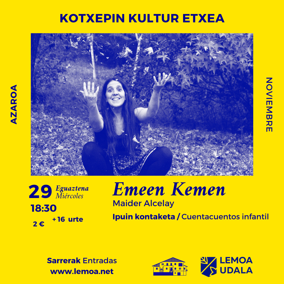 Narrazio saio musikatua: Emeen kemen – Sesión de narración oral musicada [Eus] Azaroaren 29an, eguaztena, narrazio saio musikatua izango da Kotxepinen Maider Alcelay ipuin kontalariaren eskutik eta Igor Sala musikariak lagunduta. Saioa arrastiko 18:30ean izango da. Hauek dira Maider Alcelayen hitzak: “Azken urteetan niganaino nolabait iritsi diren istorio sortak osatzen du saio hau. Batzuk irakurri … Irakurtzen jarraitu Narrazio saio musikatua: Emeen kemen – Sesión de narración oral musicada