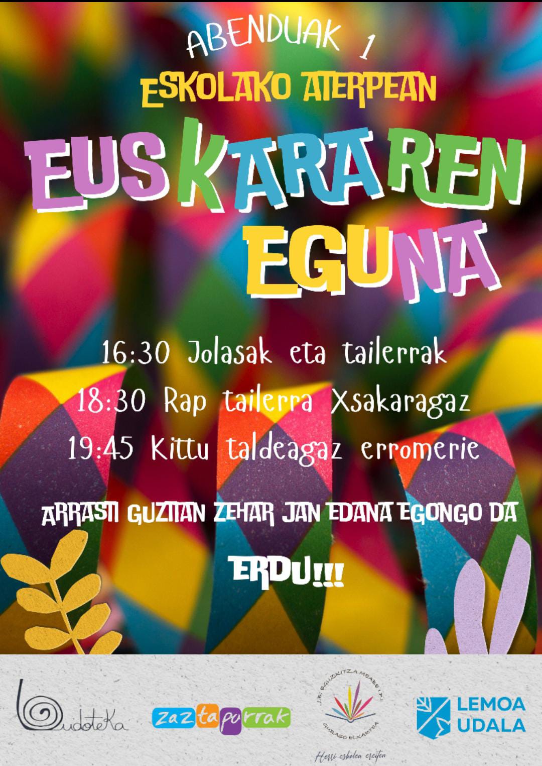 [Eus] Euskararen Nazioarteko Eguna dela eta, jardueraz betetako egitaraua antolatu du Guraso elkarteak Lemoako Udalaren laguntzarekin. Jarduera guztiak eskolako aterpean egingo dira, abenduaren 1ean. Eskolara bertaratzen diren pertsona guztiek hainbat ekintzaz gozatzeko aukera izango dute barikuan, abenduaren 1ean. Arrastiko 16:30ean askotariko jolas eta tailerretan parte hartzeko aukera izango dute umeek. Ostean, 18:30ean, rap tailerra izango … Irakurtzen jarraitu Euskararen Eguna