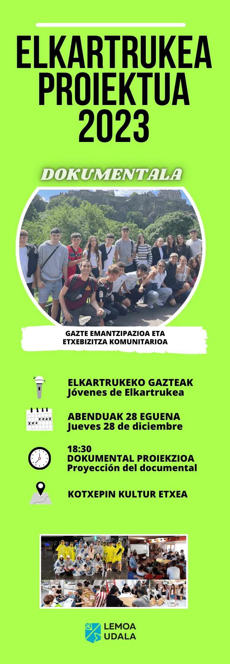 En esta ocasión, los y las jóvenes participantes en el proyecto de 2023 realizarán una presentación del trabajo de este año: un documental sobre emancipación juvenil y vivienda comunitaria. La presentación tendrá lugar el 28 de diciembre en la casa de cultura Kotxepin a las 18:30 de la tarde. En el documental, las y los jóvenes mostrarán el trabajo realizado a lo largo del año.