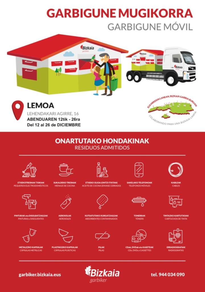 [eus] Aurten ere, etxeetan sortutako hondakin jakin batzuk behar bezala kudeatzeko aukera eskainiko die Lemoako Udalak herritarrei, Garbigune mugikorra erabiliz. Zerbitzu mugikor horren helburua birziklatzea errazagoa eta hurbilagoa egitea da, izan ere, herritarrek ez dute gaur egun dauden Garbigune tradizionaletara joan behar eta udalerrian bertan egin dezakete. Garbigune mugikorra Lehendakari Agirren egongo da abenduaren 12tik … Irakurtzen jarraitu Garbigune mugikorra Lemoan abenduaren 12tik 26ra egongo da – El Garbigune móvil estará en Lemoa desde el 12 hasta el 26 de diciembre