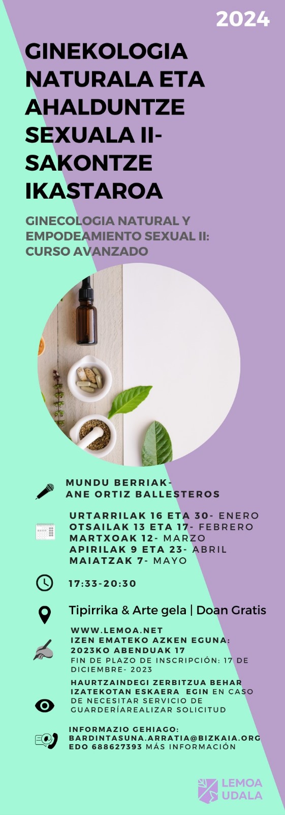 [eus] “Ginekologia eta sexu-ahalduntzea II” sakontze-ikastaroa da eta, beraz, hastapen-ikastaroan parte hartu dutenei dago zuzenduta. Tailerrean emakumeen sexu-ahalduntzea indartuko da, gorputza ezagutu eta autoestimua landuz. Horrez gain, sexualitatea modu atseginean bizi ahal izateko tresnak bereganatuko dira.