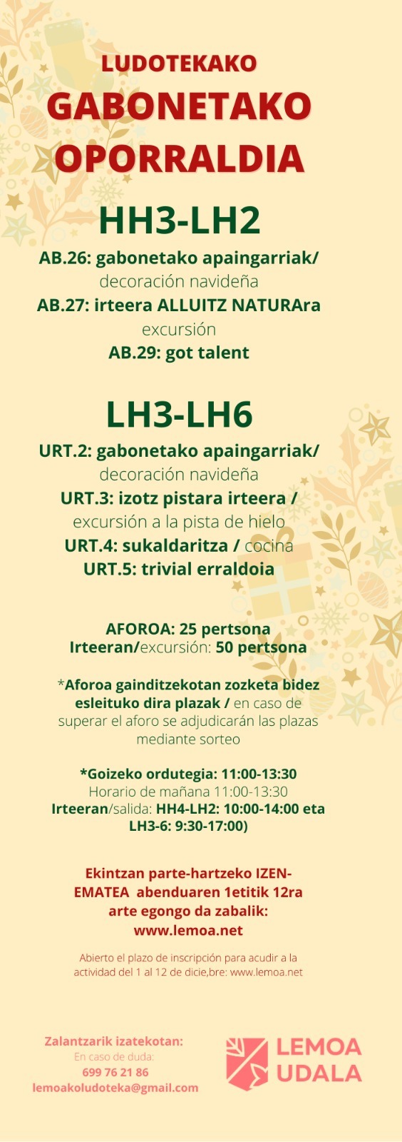 [eus] Haur Hezkuntzako eta Lehen Hezkuntzako umeek mota askotariko jarduerez gozatzeko aukera izango dute Gabonetako oporraldian zehar; izan ere, Lemoako Udalak haiei zuzendutako hainbat ekintza antolatu ditu.