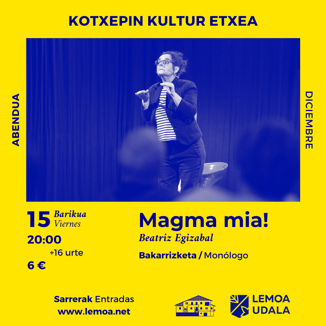 [esp] Hoy, 15 de diciembre, Beatriz Egizabal estará en la casa de cultura Kotxepin con su monólogo Magma mia! La sesión será a las 20:00 horas.