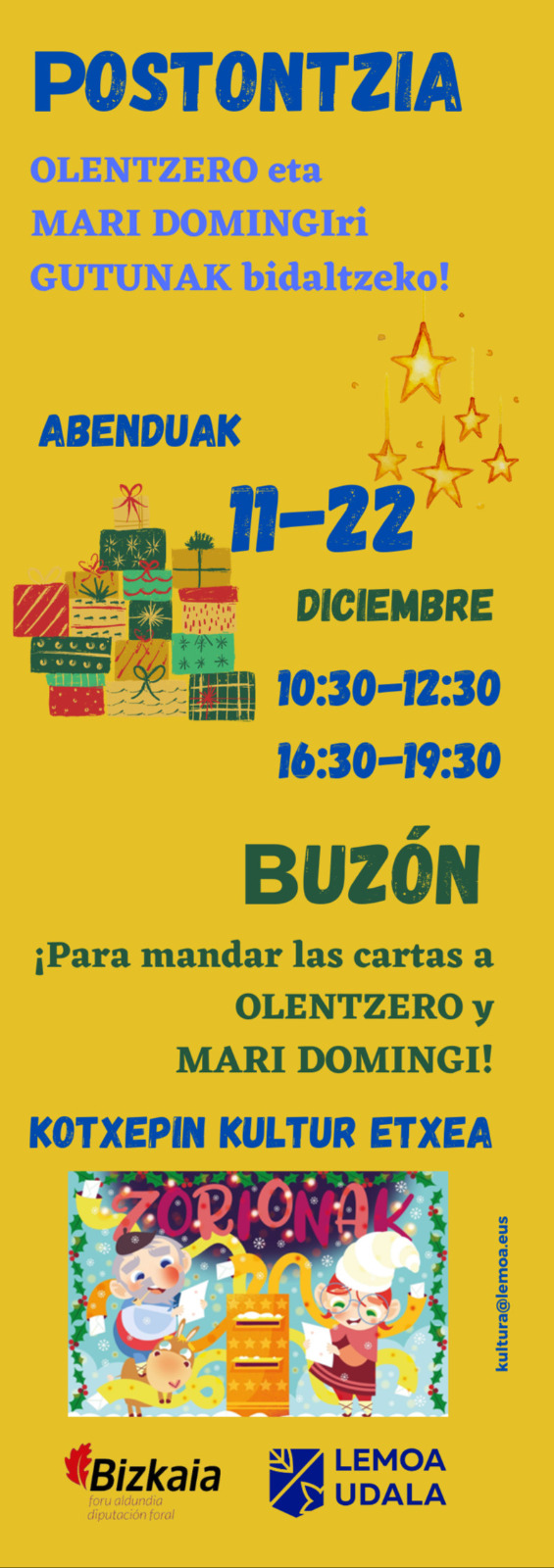 [esp] Olentzero y Mari Domingi estarán a tope de trabajo las próximas semanas, y para que los regalos lleguen a todos los hogares es necesaria una buena organización. Por ello, en el caso de los y las más pequeñas de Lemoa deberán depositar sus cartas en Kotxepin Kultur Etxea, del 11 al 22 de diciembre, de 10:30 a 12:30 horas, y de 16:30 a 19:30 horas.