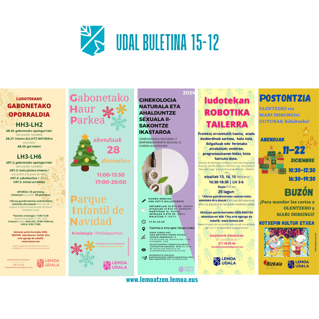 Atalak Udal buletina- Boletín digital Udal Buletina Abenduak 15 diciembre Gehiago irakurri titularraren gainean klikatuz Leer más haciendo clic sobre el titular Post author Garatzailea: lemoatzen Post date 2023-12-15 Sticky post Boletín Municipal 2024ko egutegiaren banaketa hasi da jada – El buzoneo del calendario de 2024 ya ha comenzado Garbigune mugikorra Lemoan abenduaren 12tik 26ra egongo da – El Garbigune móvil estará en Lemoa desde el 12 hasta el 26 de diciembre Hondakinak gaika biltzeko ontziak – Papeleras para recogida selectiva de residuos Bizikletaren lehentasuna eta 30 km/h-ko abiadura muga autoentzat – Prioridad de la bicicleta y límite de velocidad de 30 km/h para los coches Hiru ikastaroren izen-ematea atzeratu egin da – Se retrasa la inscripción de tres cursos Ginekologia eta sexu-ahalduntzea II: izena emateko epea abenduaren 17an itxiko da – Ginecología natural y empoderamiento sexual II: el plazo de inscripción finaliza el 17 de diciembre Robotika haurtzaroan: izena emateko epea abenduaren 17an itxiko da – Robótica en la infancia: el plazo de inscripción finaliza el 17 de diciembre Elkartrukea 2023: urtean zehar egindako lanaren aurkezpena – Presentación del trabajo realizado durante el año Ondo Etorri ekitaldiko argazkiak – Fotos del Acto de Bienvenida Jubilatu eta Pentsiodunen Elkarteak hainbat ekintza antolatu ditu abenduan – La Asociación de Personas Jubiladas y Pensionistas ha organizado varias actividades en diciembre Magma mía! Kotxepineko bazkidetza kanpaina – Campaña de socias y socios de Kotxepin Gabonetako argiak – Luces de Navidad Lemoak umeentzako jardueraz betetako egitaraua antolatu du gabonetako oporraldian zehar – Lemoa organiza un programa repleto de actividades dirigidas a niñas y niños durante las vacaciones de Navidad Olentzero eta Mari Domingi Lemoako umeen gutunen zain daude Kotxepinen – Olentzero y Mari Domingi esperan las cartas de los y las niñas de Lemoa en Kotxepin Kantu potea abenduaren 22an – Kantu pote el 22 de diciembre Gabonetan, Olentzero, Mari Domingi… – En Navidades Olentzero, Mari Domingi… Gabonetako Haur Parkea – Parque Infantil de Navidad Lemoako Gabonetako lasterketa Eneko Zamalloa Memoriala – Carrera navideña de Lemoa Memorial Eneko Zamalloa Lemoan Lan: asteroko lanpostu eskaintzak – Ofertas semanales de empleo Comparte: Share on X (Opens in new window) X Share on Facebook (Opens in new window) Facebook Atsegin dut Kargatzen... ← Ondo Etorri ekitaldiko argazkiak – Fotos del Acto de Bienvenida → Lemoan Lan: asteroko lanpostu eskaintzak – Ofertas semanales de empleo