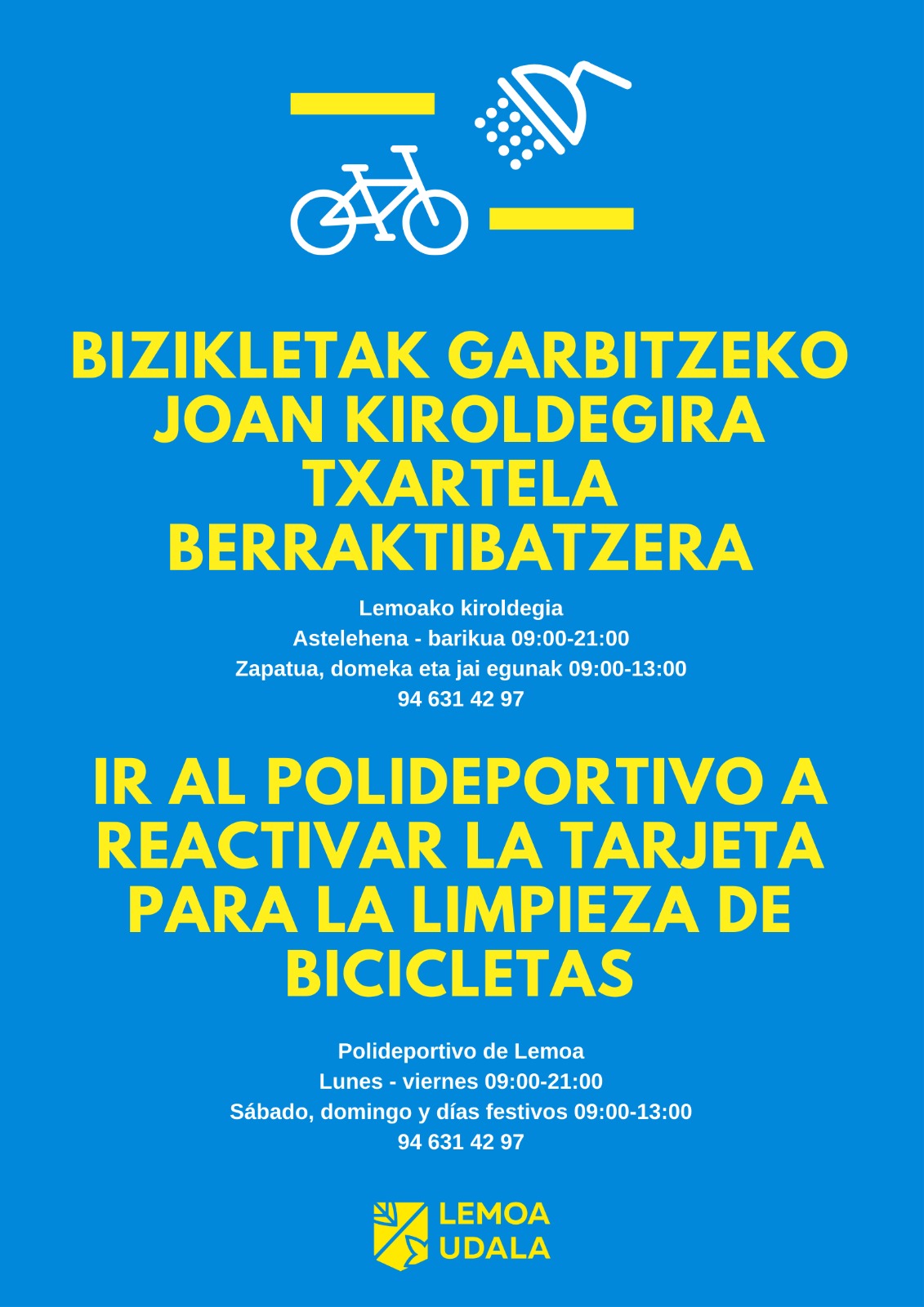 [Eus] Urtero bezala, bizikletak garbitzen jarraitu ahal izateko, txartela aktibatu behar da. Horretarako, beharrezkoa da Lemoako kiroldegira joatea.