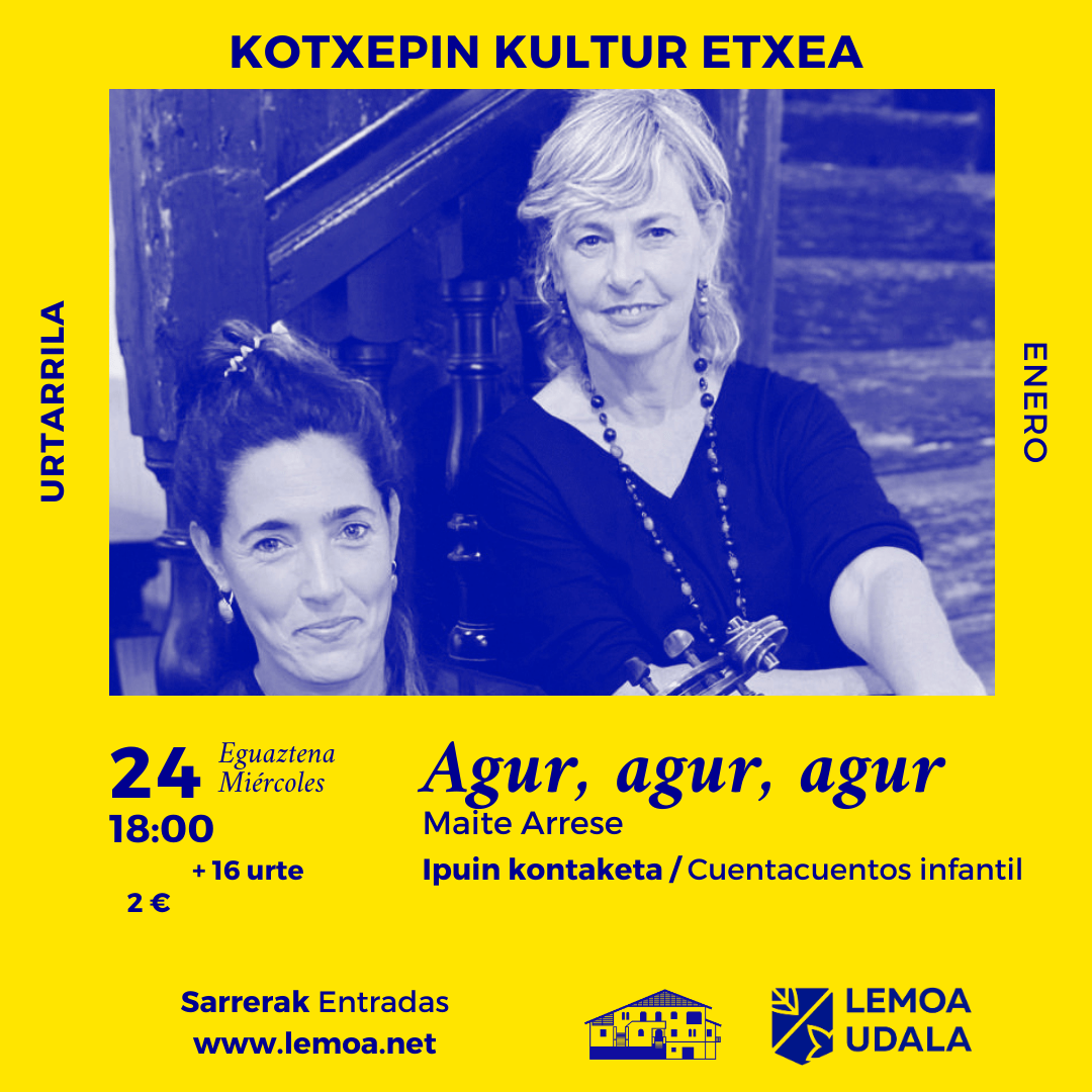 [eus] Urtarrilaren 24an “Agur, agur, agur” ipuin kontaketaz gozatzeko aukera izango da Kotxepin kultur etxean Maite Arreseren eskutik. Saioa arrastiko 18:00etan izango da.