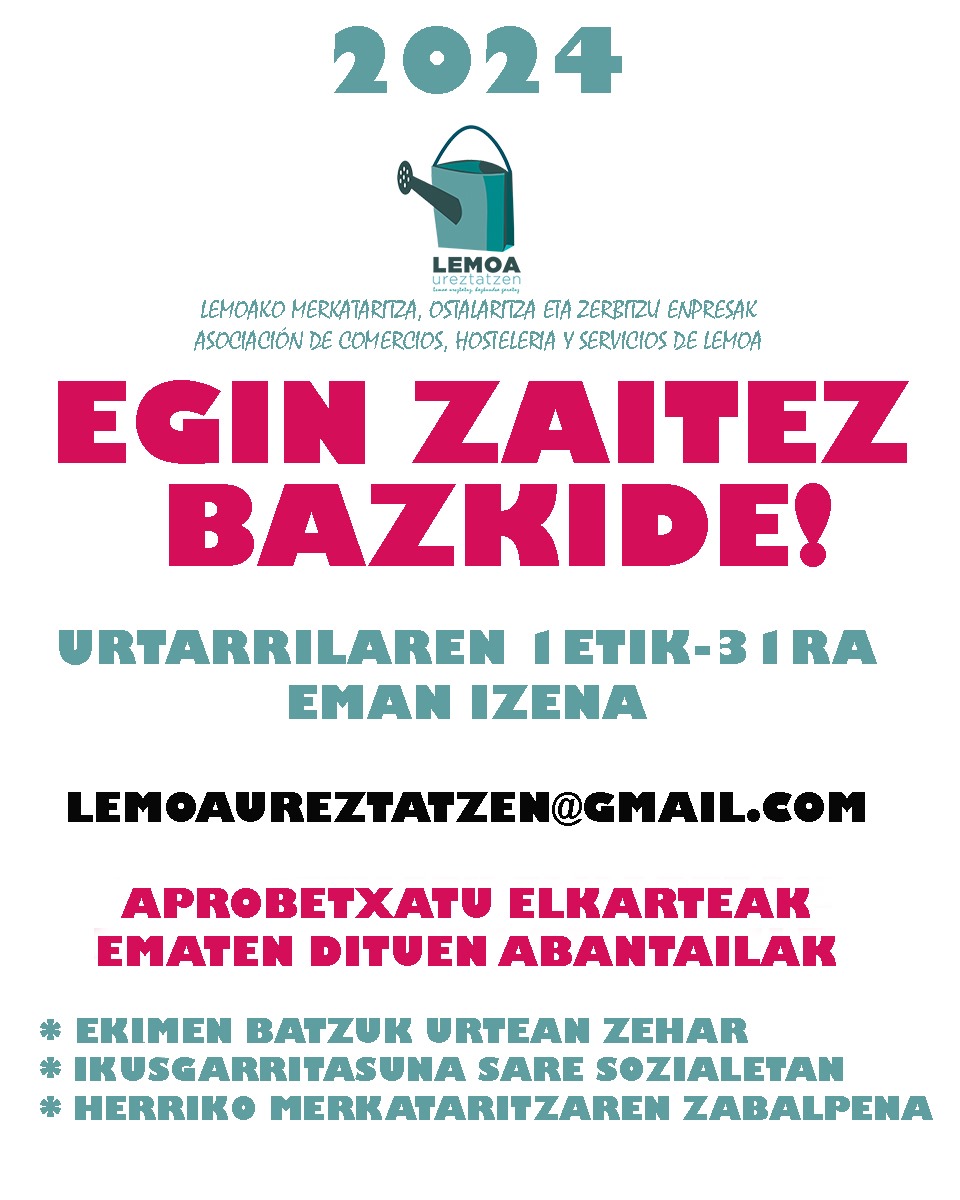 [eus] Lemoa Ureztatzen elkartearen bazkidetza kanpaina abian da, eta, beraz, Lemoako merkatarien, ostalarien eta zerbitzu-enpresen elkartearen kide izan nahi duen orok urtarrilaren 31ra arte eman ahal izango du izena, lemoaureztatzen@gmail.com helbide elektronikora mezu bat bidaliz. Elkarteko kide izateak hainbat abantaila ematen ditu, hala nola: Hona hemen 2023ko kanpainak: [cas] La campaña de socias y socios … Irakurtzen jarraitu Lemoa Ureztatzen elkartearen bazkidetza kanpaina – Campaña de socias y socios de Lemoa Ureztatzen