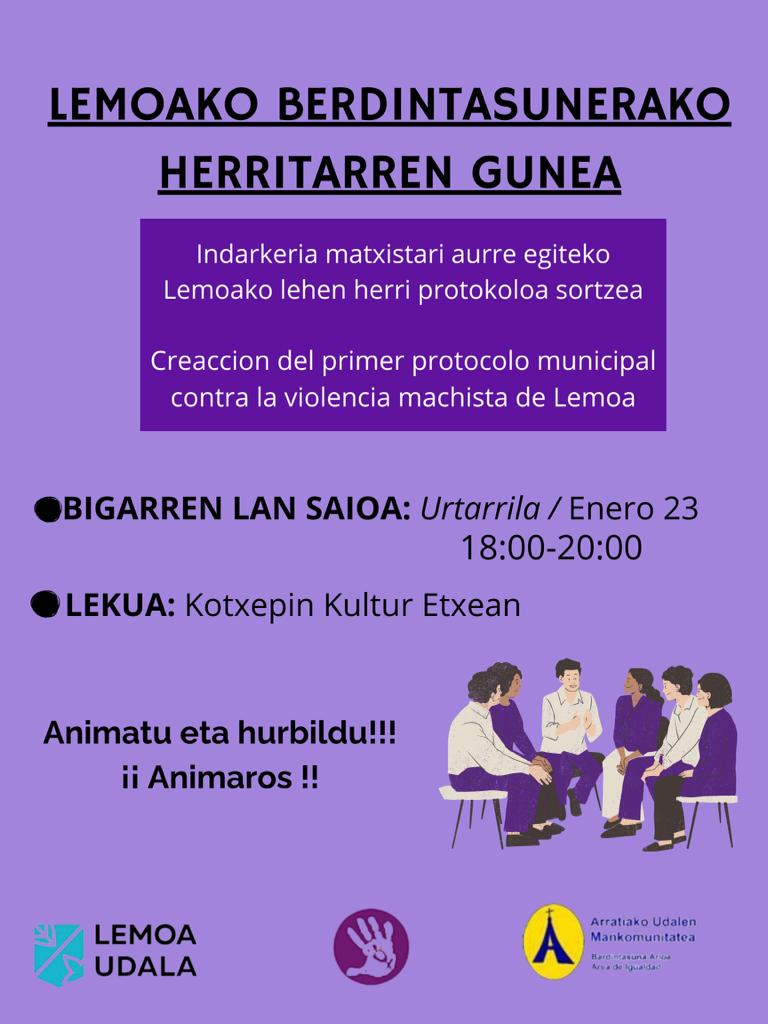 [eus] Lemoako Berdintasunerako Herritarren Gunearen bigarren lan-saioa ez da urtarrilaren 17an izango, urtarrilaren 23an baizik. Gainera, saioa Kotxepin kultur etxean egingo da arrastiko 18:00etatik 20:00etara. Helburua da indarkeria matxistari herri mailan eta modu bateratuan aurre egiteko Lemoako lehen protokoloa sortzea.
