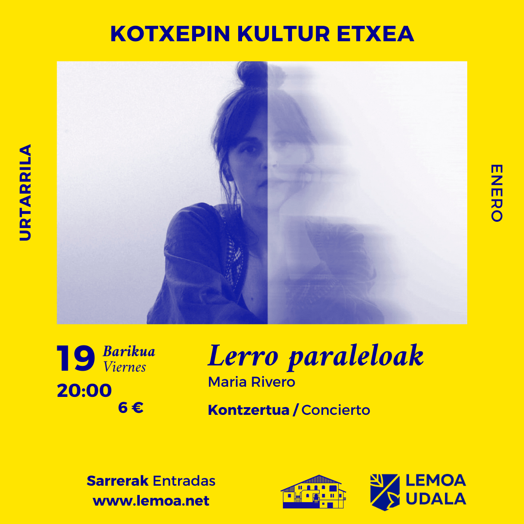 [cas] Todas aquellas personas que se acerquen al concierto que María Rivero ofrecerá el 19 de enero en la casa de cultura Kotxepin tendrán la oportunidad de conocer su segundo disco, “Lerro paraleloak”. El concierto será a las 20:00 horas, y esto es lo que cuenta la artista:
