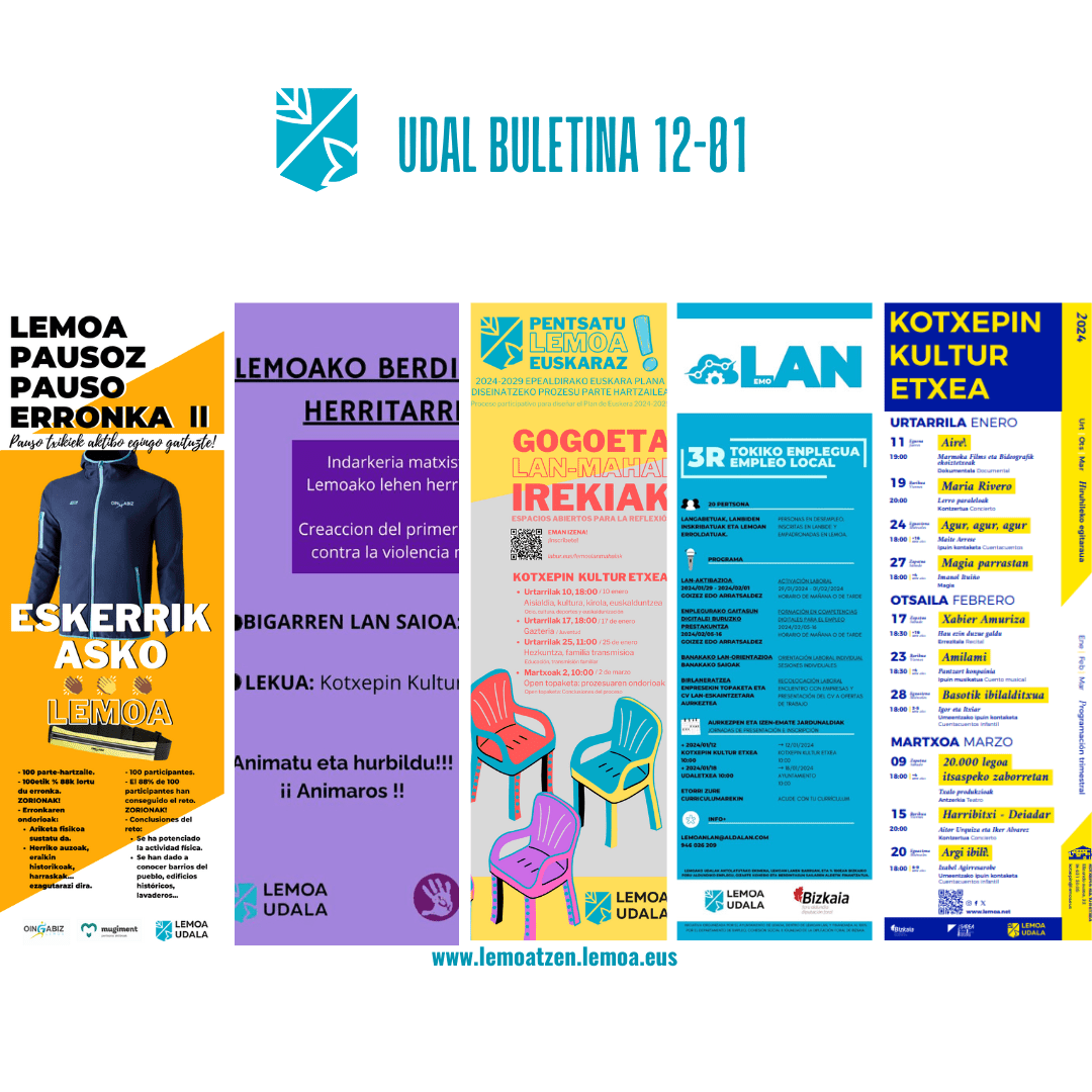 Atalak Udal buletina- Boletín digital Udal Buletina Urtarrilak 12 de enero Gehiago irakurri titularraren gainean klikatuz Leer más haciendo clic sobre el titular Post author Garatzailea: lemoatzen Post date 2024-01-12 Sticky post Boletín Municipal 2024ko ekitaldirako aurrekontuak – Presupuestos para el ejercicio 2024 Gatza bota da udalerriko auzo altuetan eta espaloietan astean zehar izandako tenperatura baxuak direla eta – Debido a las bajas temperaturas registradas esta semana se ha echado sal en los barrios altos y las aceras del municipio Kiroldegirako sarrera berria erabilgarri dago jada – El nuevo acceso al polideportivo ya está disponible Lemoako Berdintasunerako Herritarren Gunearen bigarren lan-saioa: DATA eta LEKU ALDAKETA – Segunda sesión de trabajo del Foro Ciudadano para la Igualdad de Lemoa: CAMBIO DE FECHA y LUGAR Lemoan Lan eta 3R tokiko enpleguaren aurkezpen-jardunaldia – Jornada de presentación de Lemoan Lan y 3R Empleo Local Lemoako Euskara Plana diseinatzeko lehen gogoeta saio irekia pasa den eguaztenean egin zen eta beste bi egingo dira urtarrilean – El pasado miércoles se celebró la primera sesión abierta de reflexión para diseñar el Plan de Euskera de Lemoa y en enero se celebrarán dos sesiones abiertas más Egunean Behin lehiaketaren hamalaugarren denboraldia, abian! – La decimocuarta temporada del concurso Egunean Behin, en marcha! Elkartrukea 2023: Edinburgo – Edimburgo Bukatu egin da 2023ko Lemoa Pausoz Pauso erronka – Ha finalizado el reto Lemoa Pausoz Pauso 2023 Lemoa Ureztatzen elkartearen bazkidetza kanpaina – Campaña de socias y socios de Lemoa Ureztatzen Ludoteka: HH3ko umeek eguaztenetan ludotekara joateko aukera izango dute – Ludoteca: las niñas y niños de HH3 podrán ir a la ludoteca los miércoles Antxiñe Mendizabal eta Uxue Alberdi Estibaritz idazleak umeen irakurle taldeko saioetan izango dira – Las escritoras Antxiñe Mendizabal y Uxue Alberdi Estibaritz participarán en los grupos de lectura infantiles Kotxepin Kultur Etxea: hiruhileko programazioa – Programación trimestral “Lerro paraleloak”: Maria Riverori elkarrizketa – Entrevista a Maria Rivero “Agur, agur, agur”: Maite Arreseri elkarrizketa – Entrevista a Maite Arrese Lemoan Lan: asteroko lanpostu eskaintzak – Ofertas semanales de empleo Comparte: Share on X (Opens in new window) X Share on Facebook (Opens in new window) Facebook Atsegin dut Kargatzen... ← “Agur, agur, agur”: Maite Arreseri elkarrizketa – Entrevista a Maite Arrese → Lemoan Lan: asteroko lanpostu eskaintzak – Ofertas semanales de empleo
