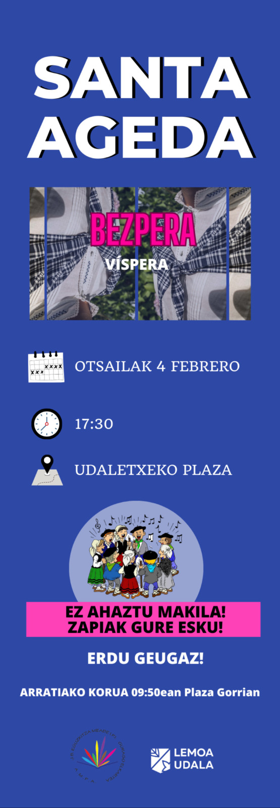 [cas] Este año la víspera de Santa Águeda se celebrará el 4 de febrero, y la programación de Lemoa ya está lista: a las 09:50 el coro de Arratia cantará en la plaza roja de Lemoa y, después, a las 17:30 de la tarde, todas y todos los lemoarras tienen cita en la plaza del ayuntamiento para llenar con canciones de Santa Águeda las calles de Lemoa.