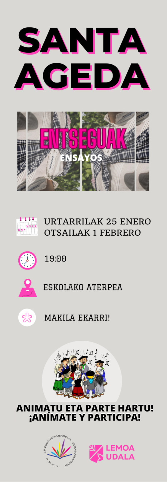 [eus] Santa Agedako eguna prestatzeko bi entsegu antolatu dira aurten, atzo egin zena eta datorren eguenean, otsailaren 1ean egingo dena. Animatu zaitezte eta ez ahaztu makila!