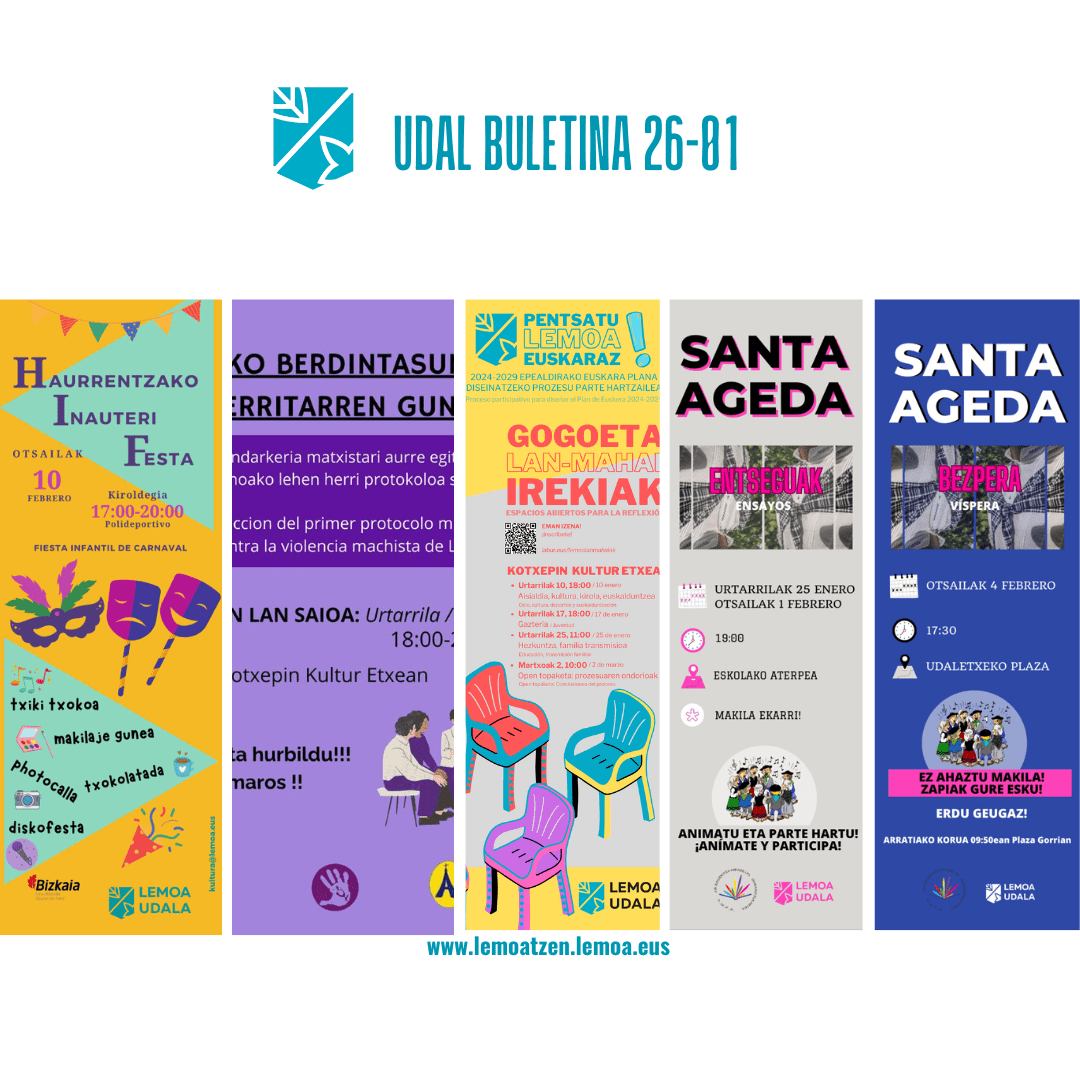 Atalak Udal buletina- Boletín digital Udal Buletina Urtarrilak 26 de enero Gehiago irakurri titularraren gainean klikatuz Leer más haciendo clic sobre el titular Post author Garatzailea: lemoatzen Post date 2024-01-26 Sticky post Boletín Municipal Zabalik herriko elkarteentzako dirulaguntzak eskatzeko epea – Abierto el plazo para solicitar las ayudas destinadas a asociaciones de Lemoa Lemoa Arratiako garapen sozioekonomikoaren alde Errota Fundazioarekin elkarlanean – Lemoa impulsa el desarrollo socioeconómico de Arratia en colaboración con Errota Fundazioa Liztor asiarren kopurua gutxitzeko aukera dugu – Podemos contribuir a minimizar la población de la avispa asiática Argiteria aldaketa Pozuetan – Nuevas luminarias en Pozueta Lemoako Berdintasunerako Herritarren Guneak bigarren lan-saioa egin du – El Foro Ciudadano para la Igualdad de Lemoa ha celebrado su segunda sesión de trabajo Lemoako Euskara Plana diseinatzeko azken gogoeta saio irekia atzo egin zen eta open topaketa martxoan egingo da – Ayer se celebró la última sesión abierta de reflexión para diseñar el Plan de Euskera de Lemoa y en marzo tendrá lugar la open topaketa Umeen Kontseilua: paradisugintzatik Lemoagintzara – Consejo de la Infancia: de inventar paraísos a reinventar Lemoa Santa Agedarako entseguak martxan dira – Los ensayos para Santa Águeda ya están en marcha Santa Ageda bezperako egitaraua – Programa de la víspera de Santa Águeda Otsailaren 5ean Txitxiburduntzi Eguna ospatuko da! – ¡El 5 de febrero se celebrará el Día del Txitxiburduntzi! Haurrentzako Inauteri Festa – Fiesta Infantil de Carnaval “Magia parrastan” – Imanol Ituiñori elkarrizketa Lemoan Lan: asteroko lanpostu eskaintzak – Ofertas semanales de empleo Comparte: Share on X (Opens in new window) X Share on Facebook (Opens in new window) Facebook Atsegin dut Kargatzen... ← Argiteria aldaketa Pozuetan – Nuevas luminarias en Pozueta → Lemoan Lan: asteroko lanpostu eskaintzak – Ofertas semanales de empleo