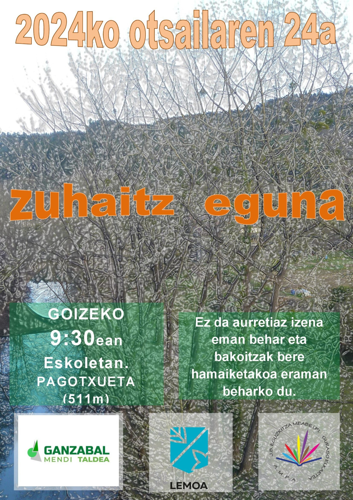 [eus] Lemoak Zuhaitz Eguna ospatuko du otsailaren 24an. Zuhaitz Egunak izaera sinbolikoa duen arren, familia-jarduera ezin hobea da txikienei gure ingurune naturalaren eta tokiko espezieen garrantzia irakasteko.