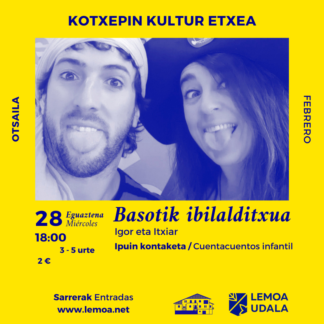 [eus] Igor eta Itxiarrek Basotik ibilalditxua ipuin kontaketa eskainiko diete 3 eta 5 urteko umeei Kotxepinen. Saioa otsailaren 28an, eguaztenean, izango da arrastiko 18:00etan.
