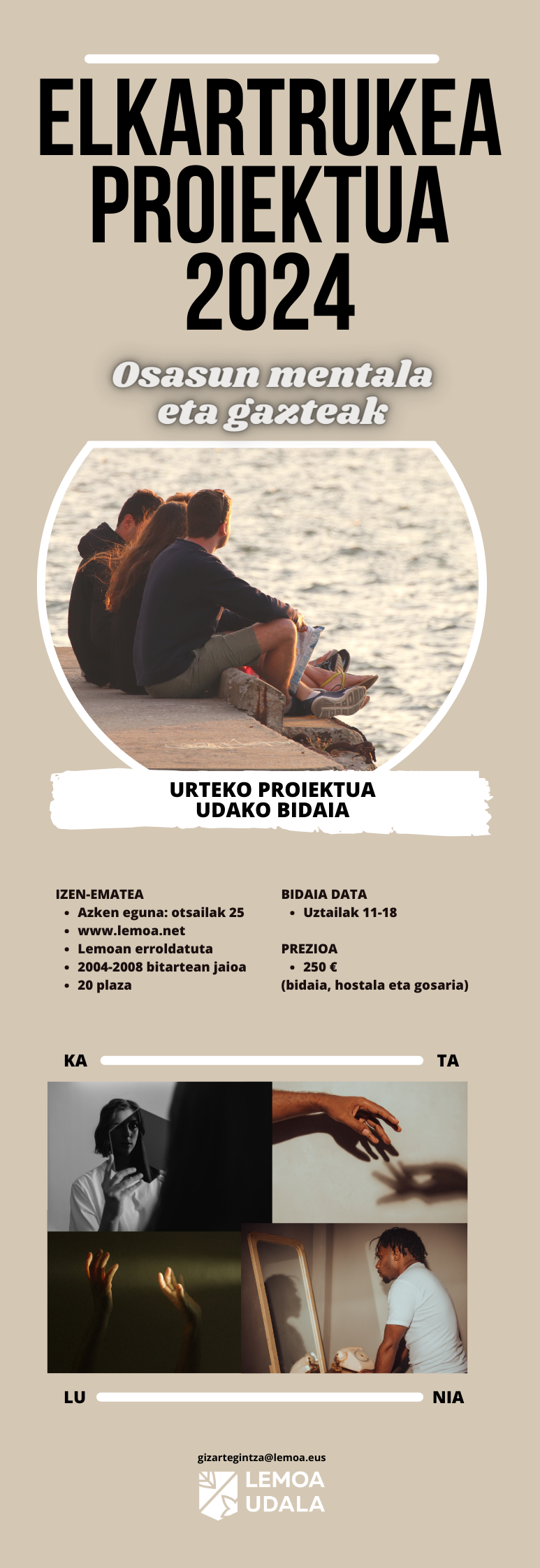 [eus] Aurten Elkartruke programako parte-hartzaileek landuko duten gaia “osasun mentala eta gazteak” da, eta udan Kataluniara joango dira. Bidaiaren zati bat Udalak ordainduko du, baina gainerakoa gazteek ordainduko dute urtean zehar burututako autofinantzaketa-ekintzen bidez. Aurtengo programan 2004-2008 bitartean jaiotako Lemoako gazteek parte hartu ahal izango dute. Elkartrukea 2024 programan izena emateko azken eguna otsailaren 25a … Irakurtzen jarraitu Elkartrukea 2024: osasun mentala eta gazteak – Salud mental y juventud