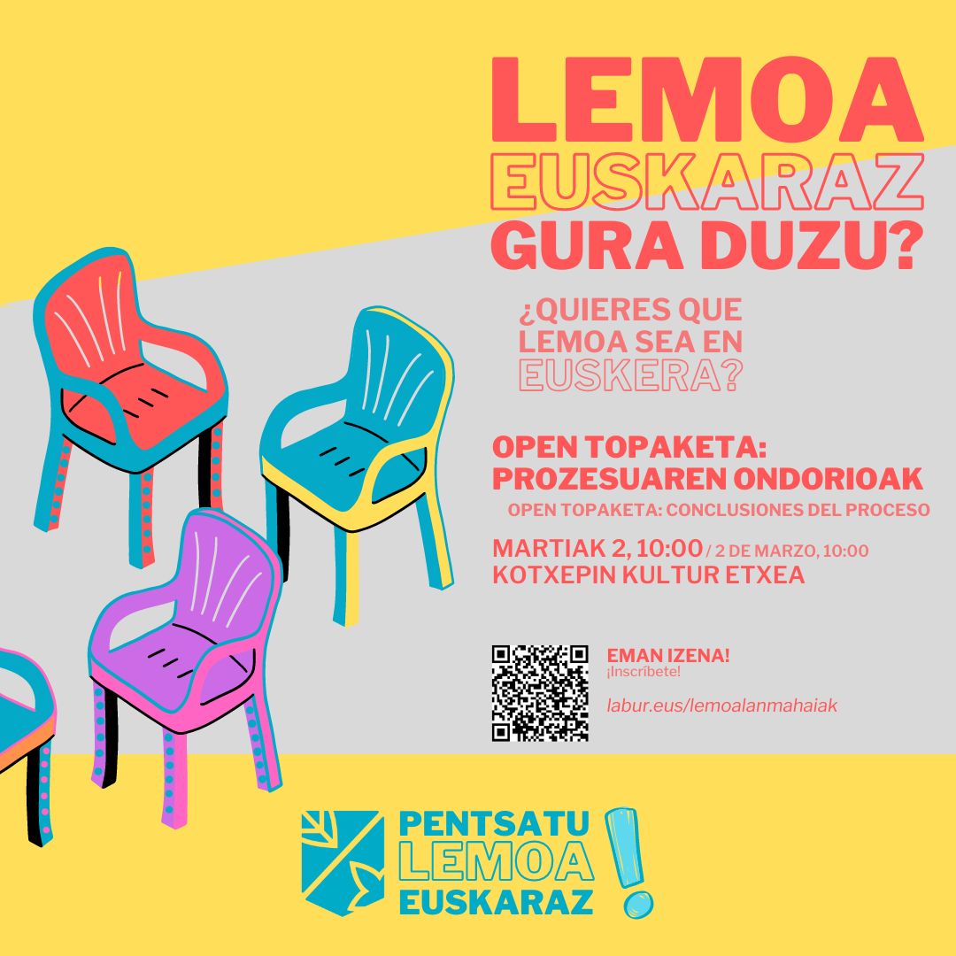 [eus] Lemoako Euskararen Plan Estrategikoa diseinatzeko lanean ari da udala azaroaz geroztik, eta horretarako herritarren laguntza zabala izan du: galdetegi bat zabaldu zen lehenengo, eta 88 erantzun jaso ziren; urtarrilean Kotxepin kultur etxean egin diren hiru lan-mahai irekietan 39 pertsona gerturatu dira, eta ikastetxean egindako azken saioan 18 ikaslek hartu dute parte. Herritarren parte hartzearen … Irakurtzen jarraitu Lemoako Euskara Plana diseinatzeko open topaketan prozesuaren ondorioak aurkeztuko dira – En la sesión open topaketa para el diseño del Plan de Euskera de Lemoa se presentarán las conclusiones del proceso