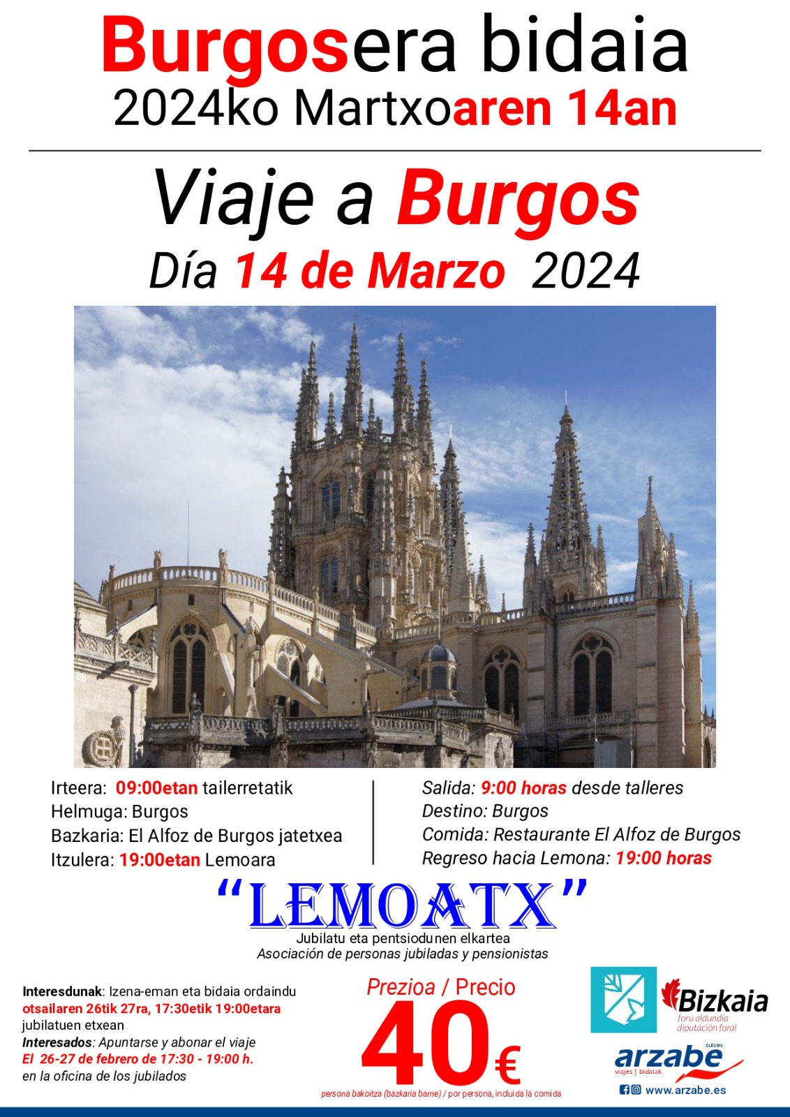 [cas] La Asociación de Personas Jubiladas y Pensionistas Lemoatx ha organizado una excursión para visitar Burgos el 14 de marzo. La inscripción podrá realizarse los días 26 y 27 de febrero en el hogar de las personas jubiladas, de 17:30 a 19:00.