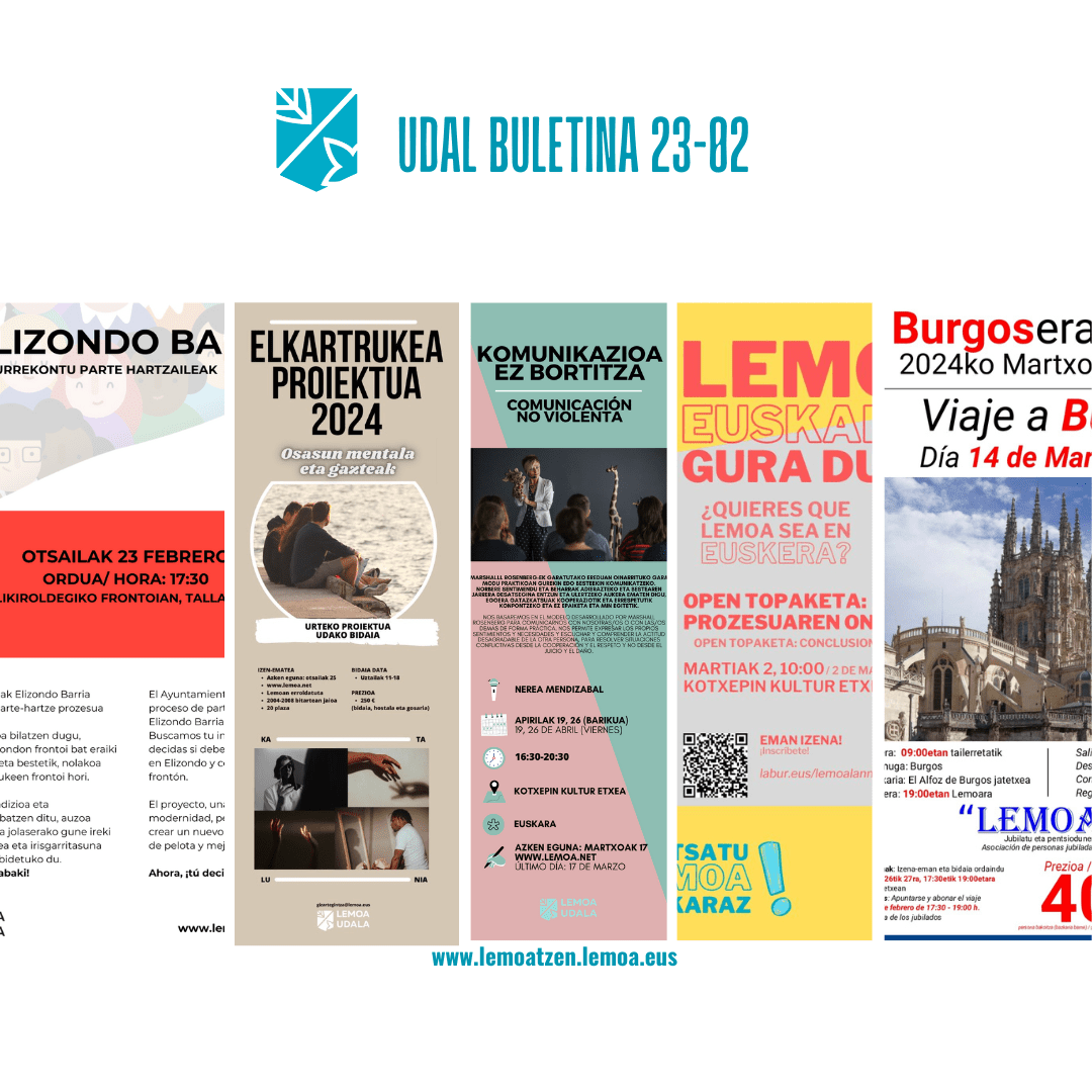 Atalak Udal buletina- Boletín digital Udal Buletina Otsailak 23 de febrero Gehiago irakurri titularraren gainean klikatuz Leer más haciendo clic sobre el titular Post author Garatzailea: lemoatzen Post date 2024-02-23 Sticky post Boletín Municipal Elizondon frontoi bat eraikitzeko aukerari buruzko prozesu parte-hartzailea irekiko da – Se abre un proceso participativo sobre la posibilidad de construir un frontón en Elizondo Ostalaritza eta ikus-entzunezkoen sektorea bultzatzen– Impulso a la hostelería y al sector audiovisual Lemoako Udalak eta Lemoa Ureztatzen elkarteak hitzarmena berritu dute – El Ayuntamiento de Lemoa y la asociación Lemoa Ureztatzen renuevan su convenio Hesien garbiketa – Un lavado de cara a las vallas Markesina berria txakurrentzako parkean – Nueva marquesina en el parque para perros Enplegagarritasunean laguntzen Lemoan Lan bitartez – Acompañando a la empleabilidad con Lemoan Lan KZguneko hezitzailea Lemoan izango da martxoaren 1ean – El instructor/a del KZgune estará en Lemoa el 1 de marzo bideON ARRATIANek garraio-zerbitzu jasangarria zabaldu egingo du gazteentzako eskariaren araberakoa Bilboko unibertsitate campusetara – bideON ARRATIAN extiende su servicio sostenible de transporte a demanda para jóvenes a los campus universitarios de Bilbao Haurtzaroko Herriek Lemoarekin “match” egin zutenekoa – Cuando los Pueblos de la Infancia hicieron “match” con Lemoa Elkartrukea 2024: osasun mentala eta gazteak – Salud mental y juventud Komunikazio ez bortitza – Comunicación no violenta Lemoatx Elkartearen irteera Burgosera – Excursión a Burgos de la Asociación Lemoatx Zuhaitz Eguna martxoaren 3ra atzeratu da – El Día del Árbol se retrasa al 3 de marzo Lemoako Euskara Plana diseinatzeko open topaketan prozesuaren ondorioak aurkeztuko dira – En la sesión open topaketa para el diseño del Plan de Euskera de Lemoa se presentarán las conclusiones del proceso ‘Euskaraz Barra-barra’ kanpainaren ihes gelatik 76 herritar pasa dira, eta 19 establezimenduk eman dute izena – Por la sala de escape de la campaña ‘Euskaraz Barra-barra’ han pasado 76 personas, y se han inscrito 19 establecimientos Tostada txapelketak zapore gozoa utzi du – El campeonato de tostadas deja un buen sabor de boca Faktura elektrikoa ulertzeko eta hobetzeko tailerra – Taller para entender y mejorar la factura eléctrica Gaur Amilami ipuin musikatua Kotxepinen – Hoy en Kotxepin el cuento musical Amilami “Basotik ibilalditxua” umeentzako ipuin kontaketa – Cuentacuentos infantil Lemoan Lan: asteroko lanpostu eskaintzak – Ofertas semanales de empleo Comparte: Share on X (Opens in new window) X Share on Facebook (Opens in new window) Facebook Atsegin dut Kargatzen... ← Faktura elektrikoa ulertzeko eta hobetzeko tailerra – Taller para entender y mejorar la factura eléctrica → Lemoan Lan: asteroko lanpostu eskaintzak – Ofertas semanales de empleo