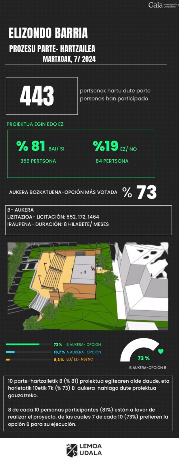 [eus] Lemoako Udalak Elizondon frontoi bat eraikitzeko aukerari buruz abiatu zuen parte-hartze prozesua joan den asteko barikuan, martxoaren 1ean, itxi zen. Orotara 443 pertsonak parte hartu dute prozesuan. Udalak oso positibotzat jo du esperientzia, eta parte-hartzea eta kontsulta publikoak piztu duen interesa ospatu ditu. Parte-hartzaileen % 81ek baietz esan zion frontoia eraikitzeari, eta, horietatik, 10etik 7k … Irakurtzen jarraitu Eskerrik asko, Lemoa: erabaki egin duzue! – ¡Habéis decidido!