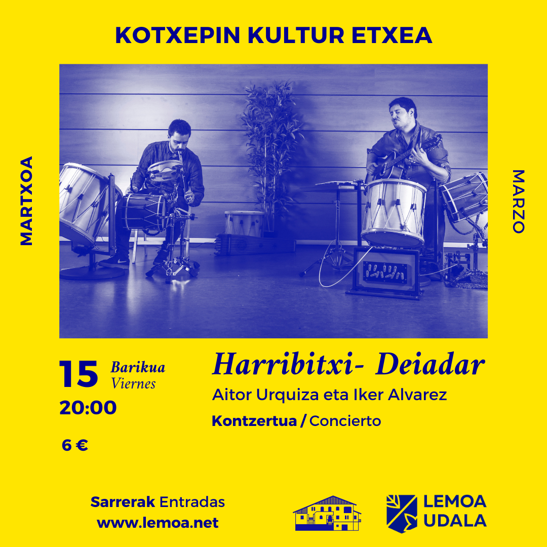 [eus] Martxoaren 15ean Aitor Urquizak eta Iker Alvarezek kontzertua eskainiko dute Kotxepinen: Deiadar. Zera kontatzen dute: 1. Zer aurkituko du Kotxepinera zuen kontzertua ikustera hurbiltzen denak? Txistulari duoari etekinik handiena ateratzeko xedea duen musikari bikotea. Orkestra gizonen antzera, esku eta hankak aldi berean erabiliz, txistuaren esparruan guztiz berria den set instrumental baten bitartez, musika tradizionalean … Irakurtzen jarraitu Harribitxiren kontzertua: “Deiadar” – Concierto