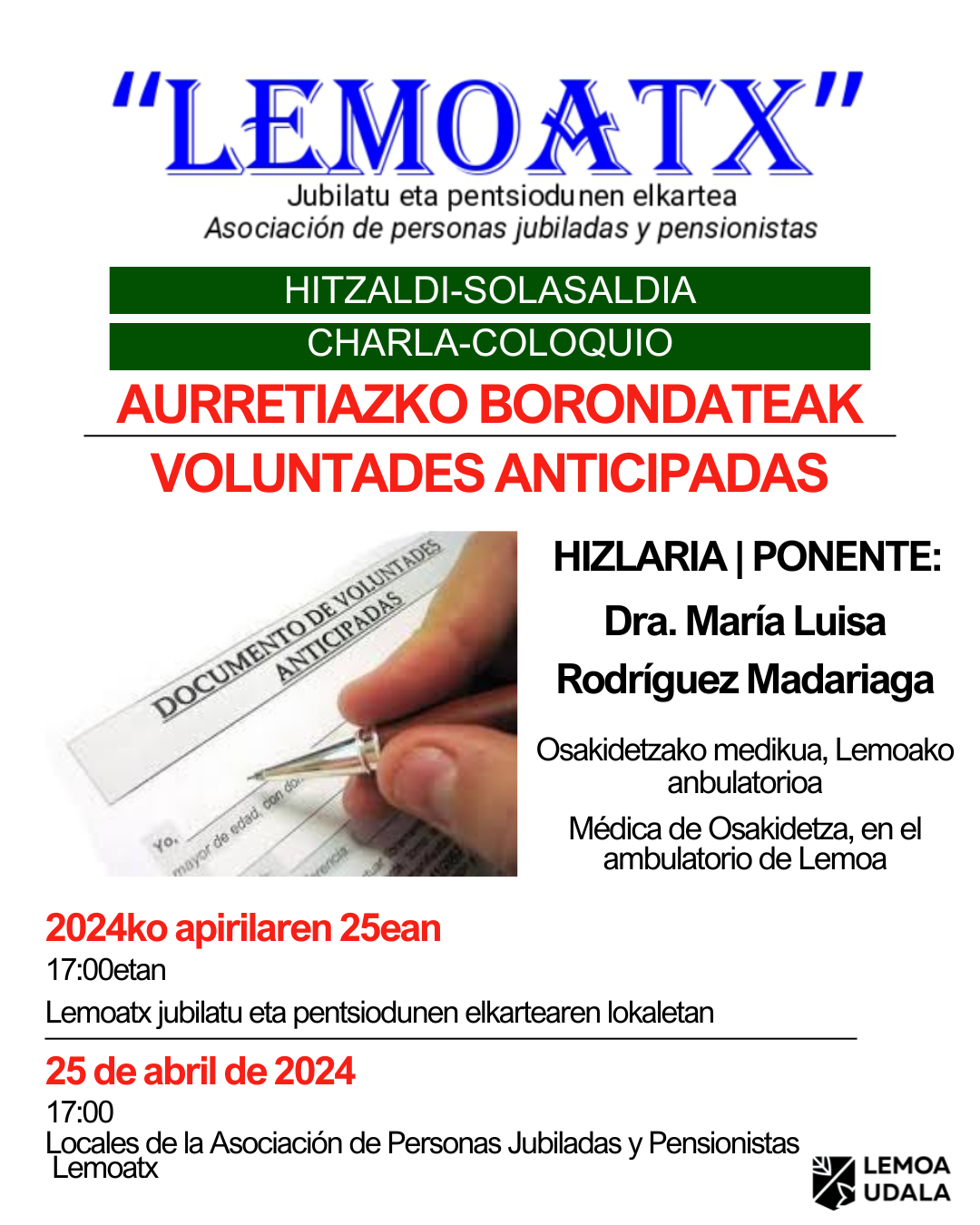 [eus] Apirilaren 25ean, María Luisa Rodríguez Madariaga Lemoako anbulatorioko medikuak aurretiazko borondateei buruzko hitzaldia eskainiko du Lemoatx elkartearen lokaletan. Publiko guztiei zuzendutako hitzaldia izango da, eta arrastiko 17:00etan hasiko da. [cas] El 25 de abril la Dra. María Luisa Rodríguez Madariaga, médica del ambulatorio de Lemoa, ofrecerá una charla sobre voluntades anticipadas en los locales … Irakurtzen jarraitu Aurretiazko borondateei buruzko hitzaldi-solasaldia – Charla-coloquio sobre voluntades anticipadas